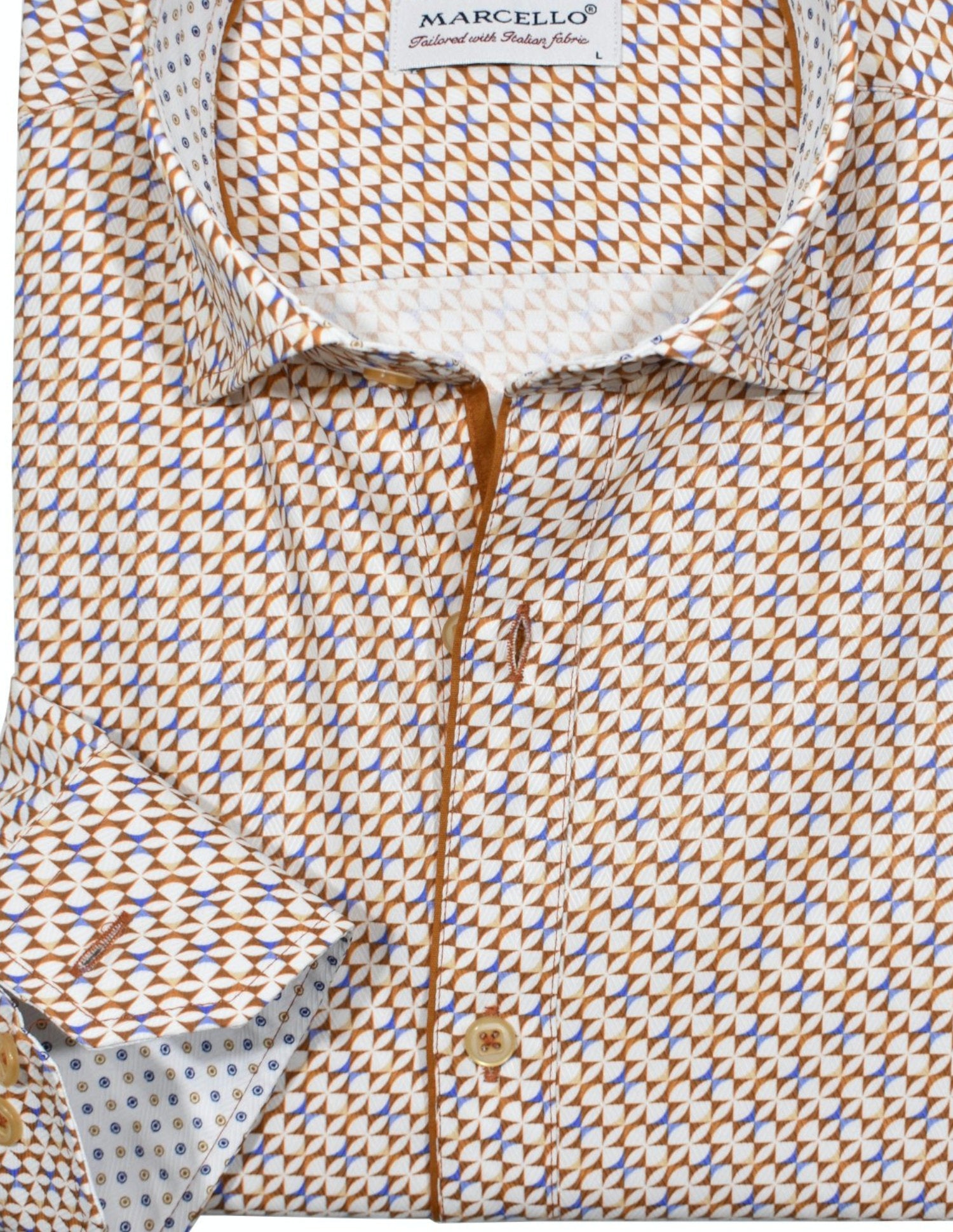 Indulge in luxurious comfort with W044 Copper Fleur by Marcello Sport. The soft cotton sateen fabric provides a luxurious touch while accent taping and matched buttons add a touch of elegance. The medium hidden button down collar keeps you looking sharp. Elevate your style with matched edge piping and trim fabric.