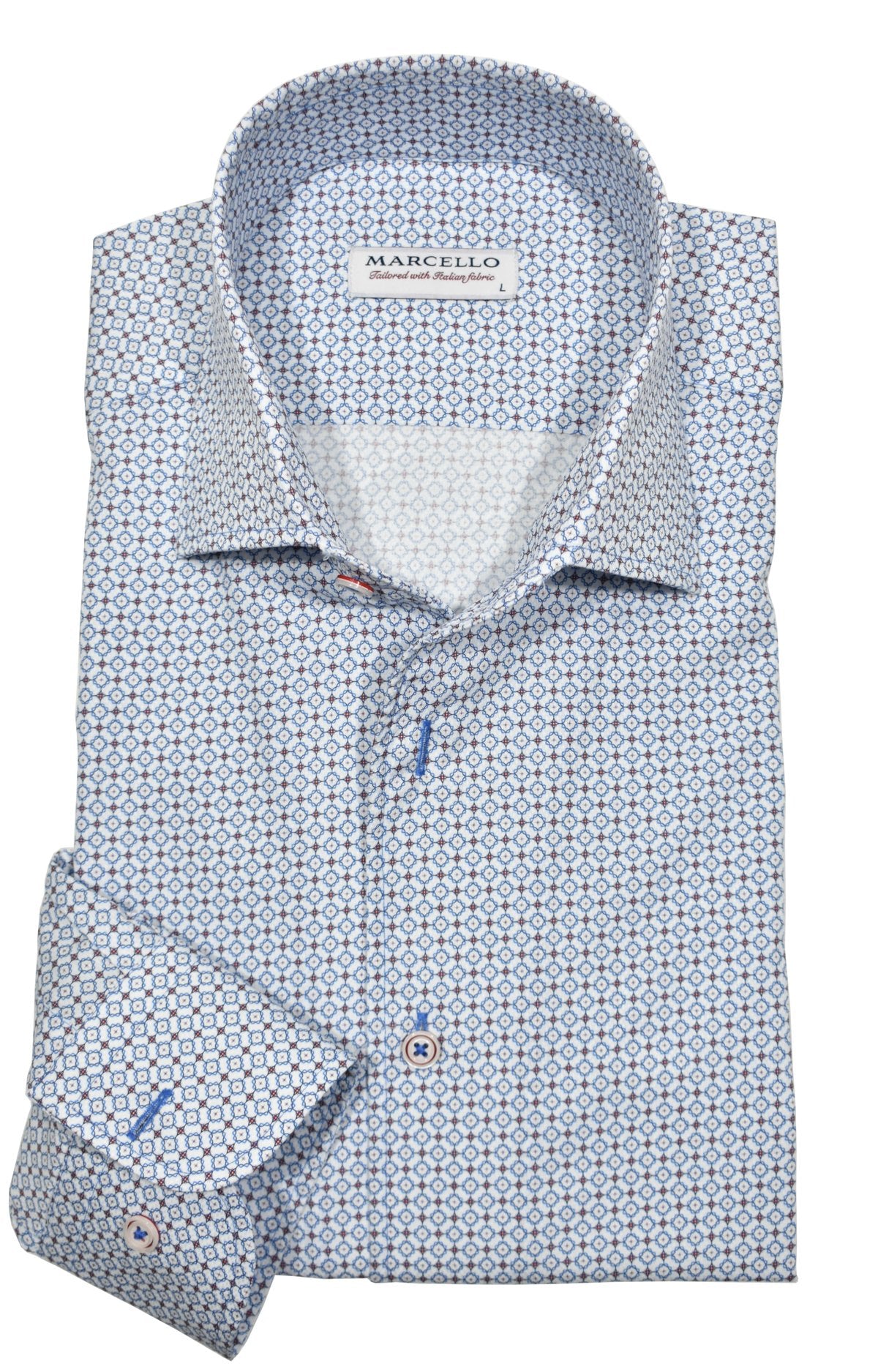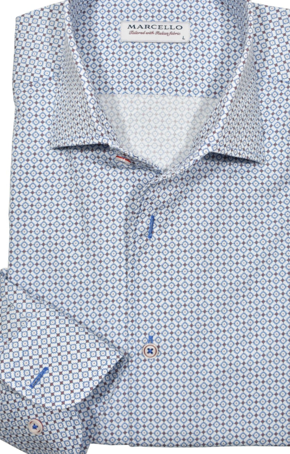 Enhance your style and comfort with the Marcello Venice Star Sport Shirt. Experience the luxurious feel of soft cotton sateen and the sleek look of the exclusive one piece roll collar. The elegant fine diamond medallion in classic blue and mocha shades adds a touch of sophistication to any outfit.