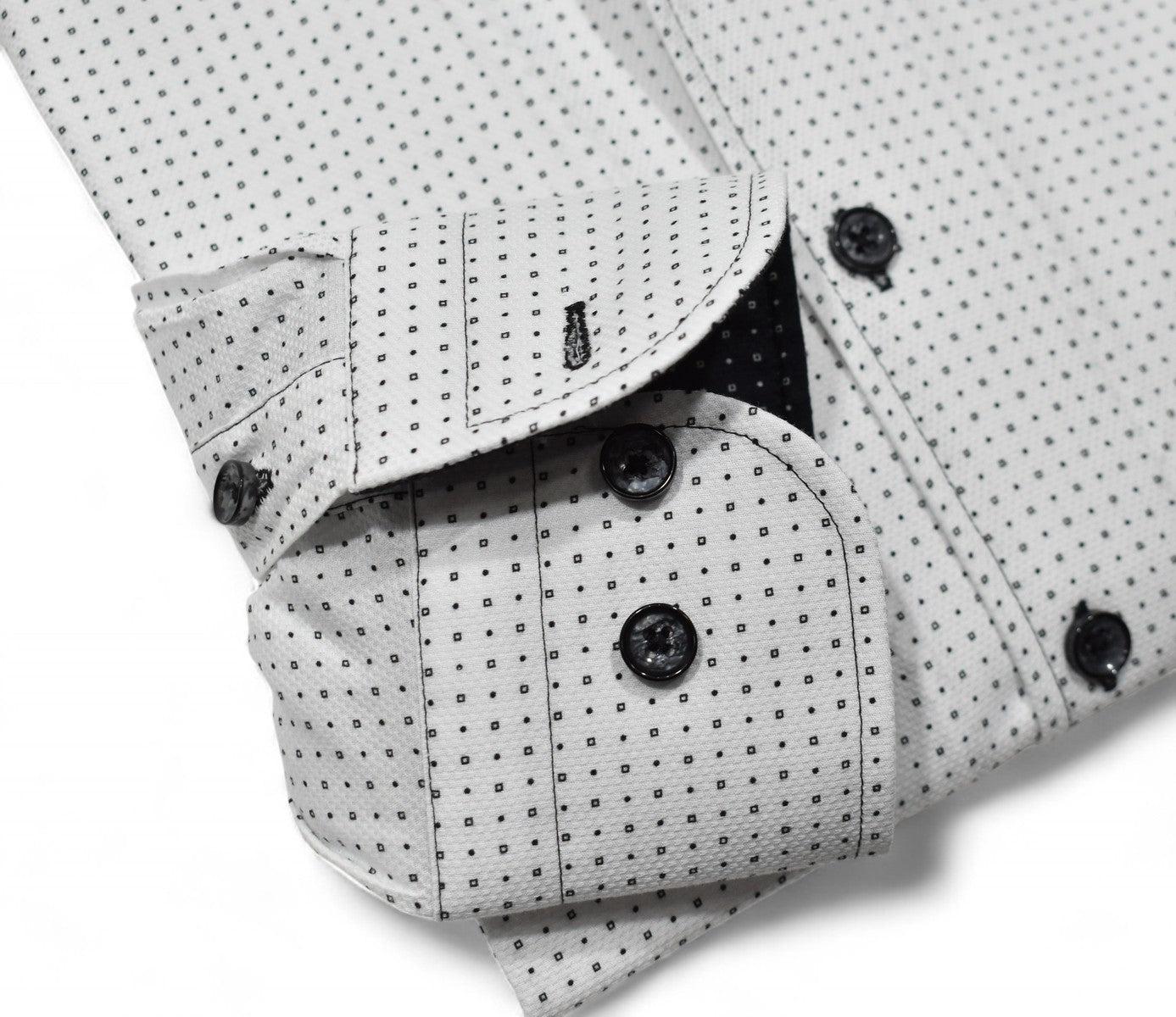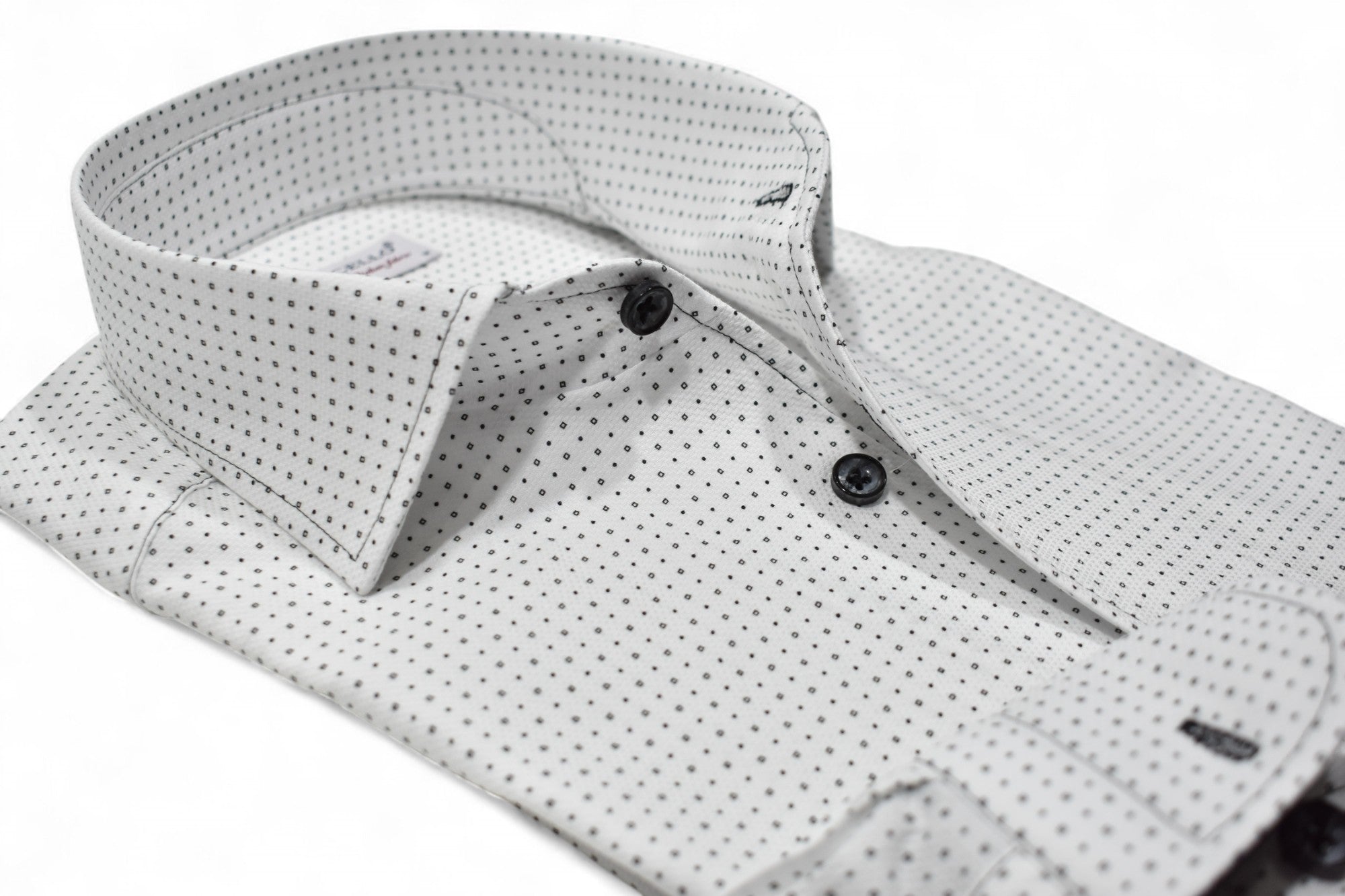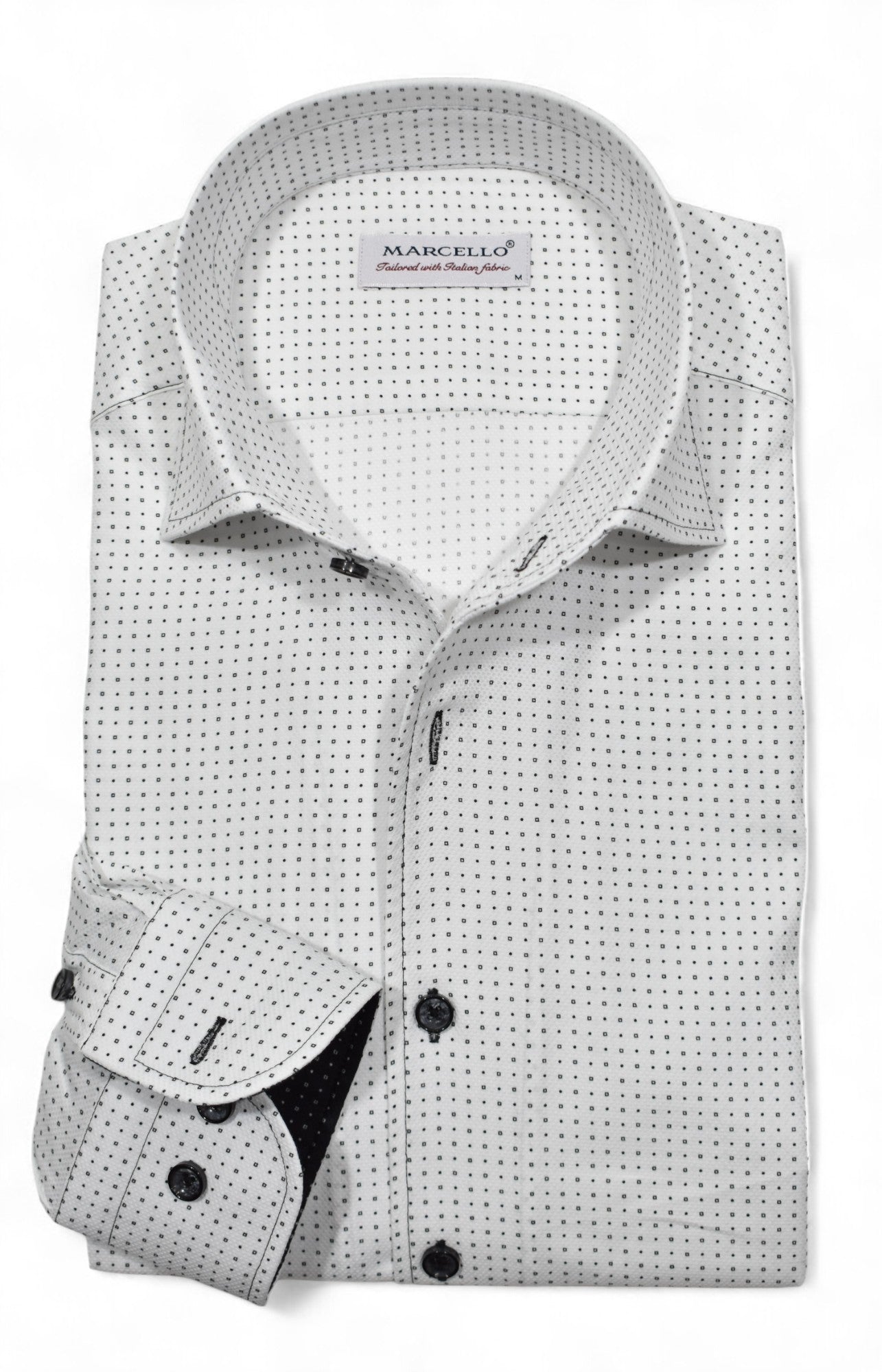 Elevate your everyday wardrobe with this refined white shirt, featuring an intricate fine dot and square print that commands attention without demanding it. The expertly crafted one-piece collar—a Marcello signature—delivers timeless sophistication, while premium soft-touch cotton and hand-selected buttons ensure comfort meets luxury. Coordinated stitch detailing and a classically proportioned fit make this versatile piece the perfect foundation for black pants, denim, or layered styling. Understated elegance that speaks volumes.