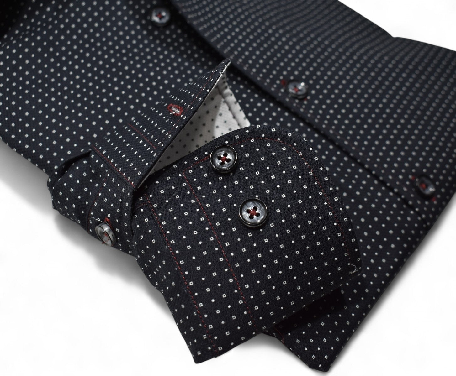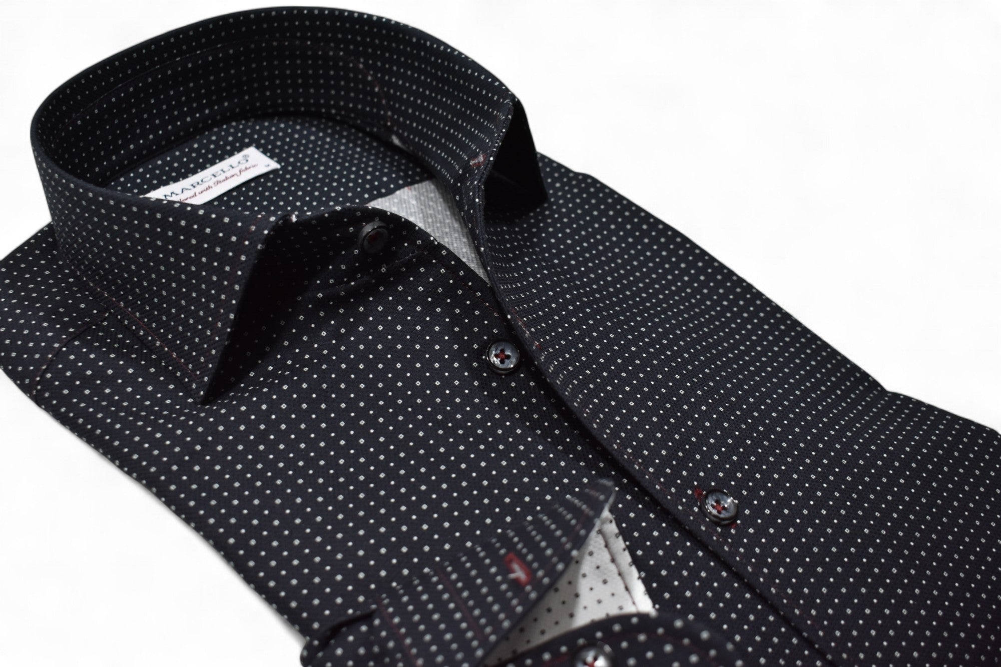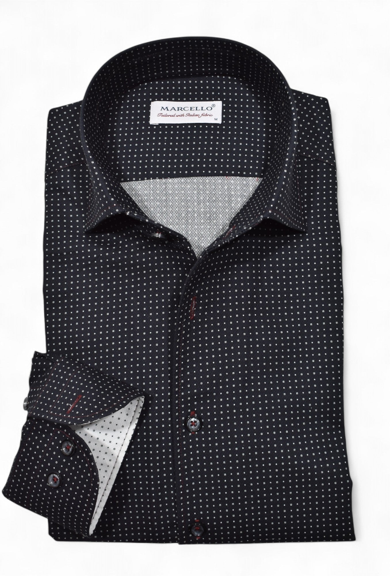 Master the art of contrast with this striking black shirt, where a crisp white fine dot and square print creates visual depth and modern sophistication. Built on Marcello's perfected one-piece collar design, this piece combines premium cotton construction with meticulously chosen buttons and precision stitching for an elevated finish. The classic silhouette adapts seamlessly to any occasion—dress it up with tailored trousers or down with your favorite denim. Timeless style with contemporary edge.