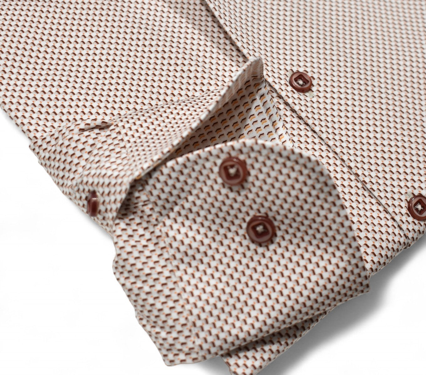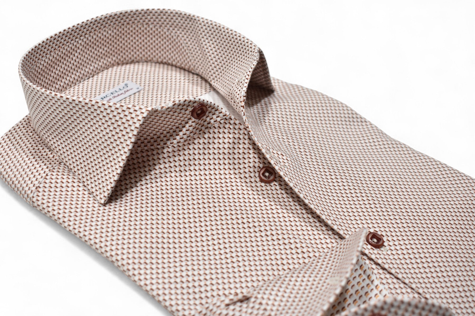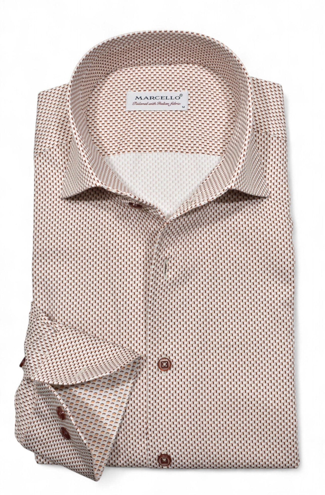 With the Marcello perfect one piece collar, this small geometric pattern in warm rust and tan is sure to work well in any setting. For hard to find shirts to go with tan or chocolate bottoms, this one will work well. Matched buttons and a classic shaped fit.