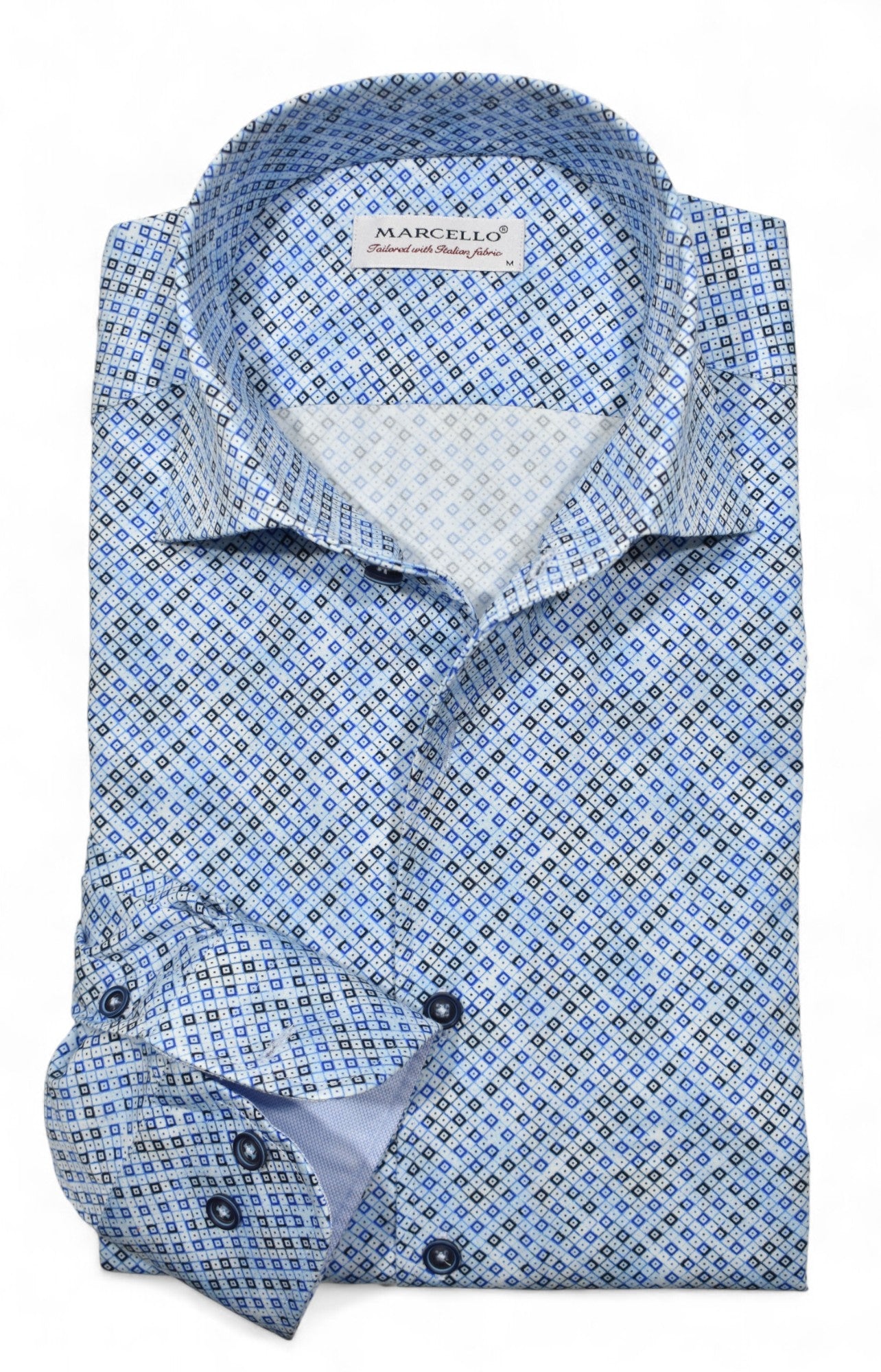 The array of shaded diamonds in the blue tones creates a cool look for your next sport shirt. Modeled in the Marcello perfected one piece collar on soft touch cotton sateen fabric to feel and look great. Hand selected buttons, trim fabric and tonal fabric. Classic shaped fit.