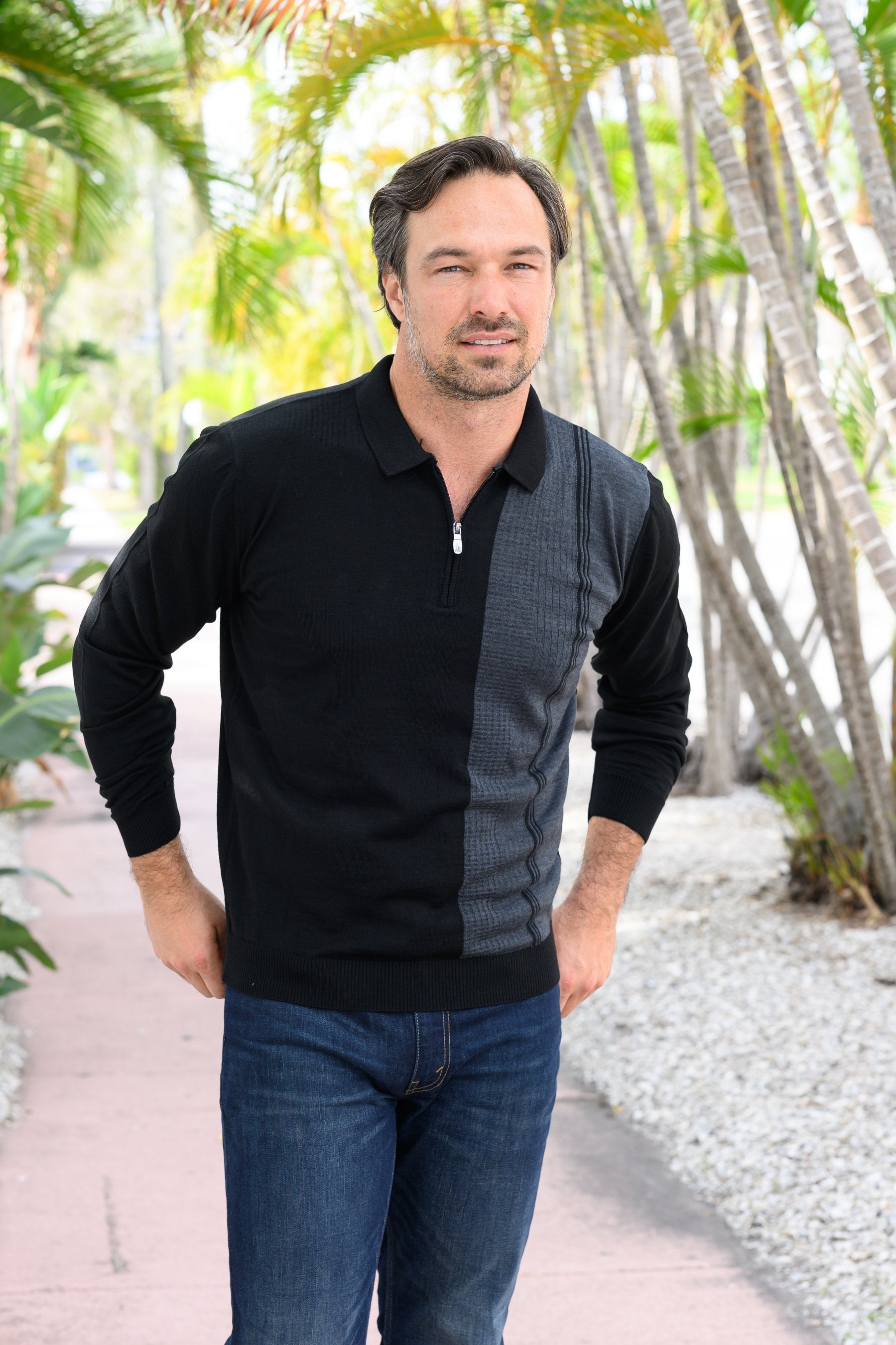 Upgrade your wardrobe with the Marcello 923 Verasano Sport Knit. Featuring a cool black zip polo with a unique vertical charcoal panel, this long sleeve polo will elevate your style. From retro to contemporary, it's versatile and stylish for any occasion.