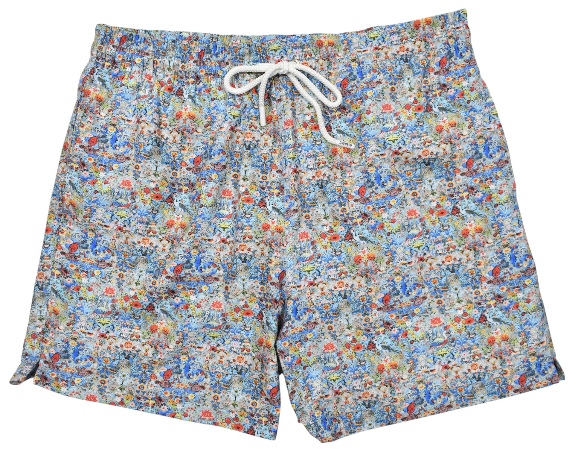 Soft quick dry fabric with a classic mesh lining. Front drawstrings with metal Marcello engraved ends. Front draw string grommets to allow tying outside or inside. Back center seam upper grommets to release air. Back pocket with button hole to release water. Delivered in a solid navy travel bag, with Marcello stamped in white, red draw strings and white stitching. Classic fit, 5.5" length.