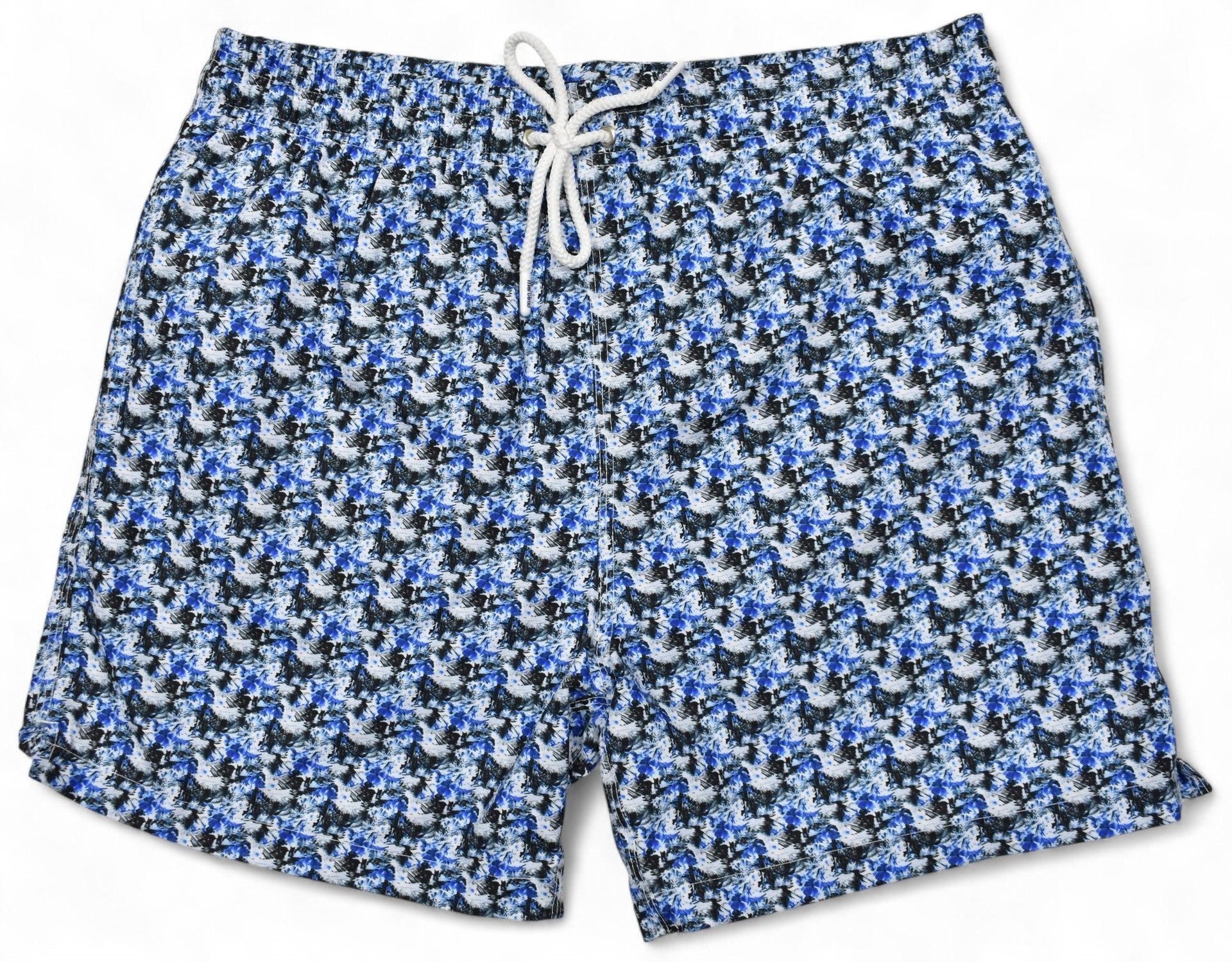 Soft quick dry fabric with a classic mesh lining. Front drawstrings with metal Marcello engraved ends. Front draw string grommets to allow tying outside or inside. Back center seam upper grommets to release air. Back pocket with button hole to release water. Delivered in a solid navy travel bag, with Marcello stamped in white, red draw strings and white stitching. Classic fit, 5.5" length.