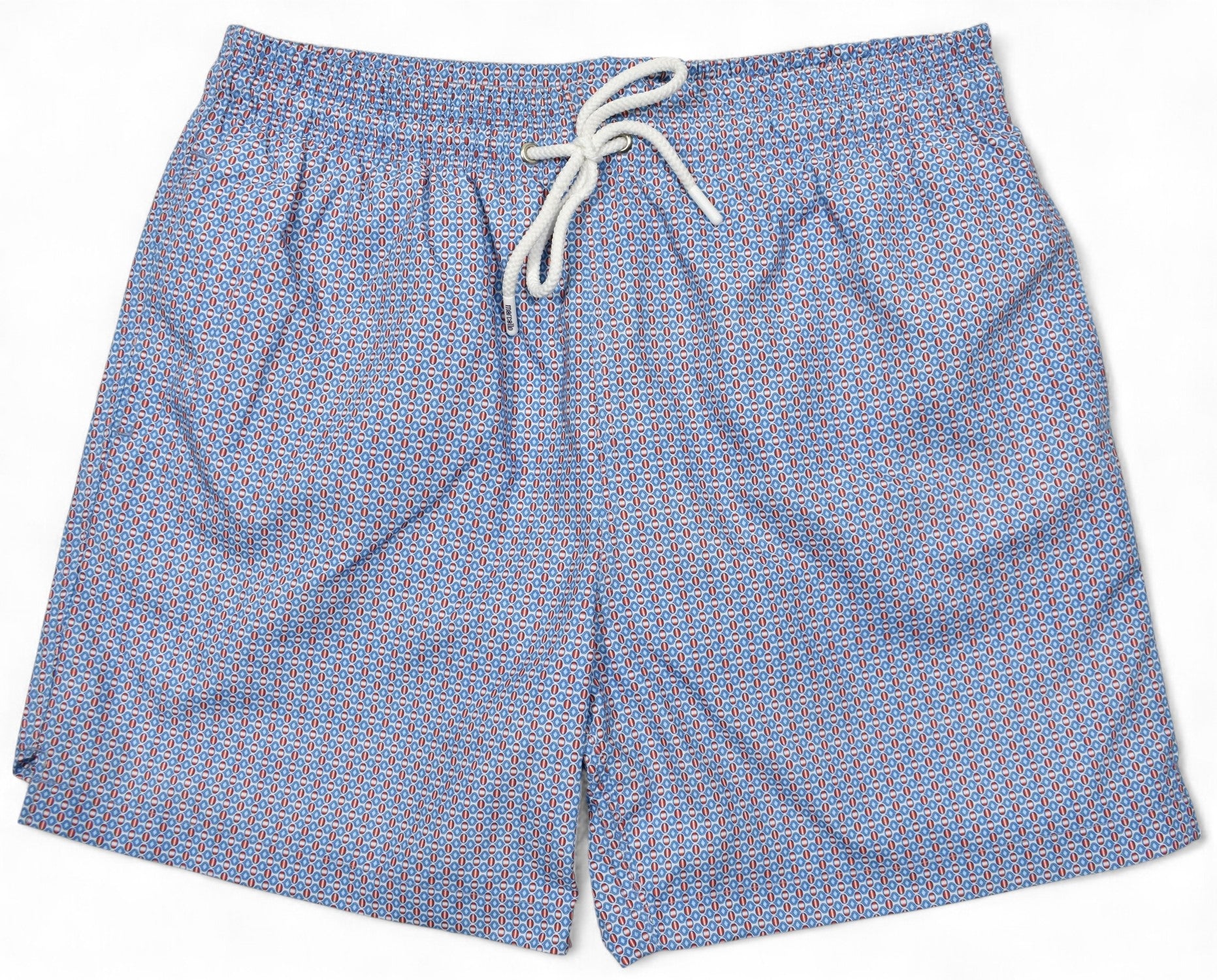 Soft quick dry fabric with a classic mesh lining. Front drawstrings with metal Marcello engraved ends. Front draw string grommets to allow tying outside or inside. Back center seam upper grommets to release air. Back pocket with button hole to release water. Delivered in a solid navy travel bag, with Marcello stamped in white, red draw strings and white stitching. Classic fit, 5.5" length.