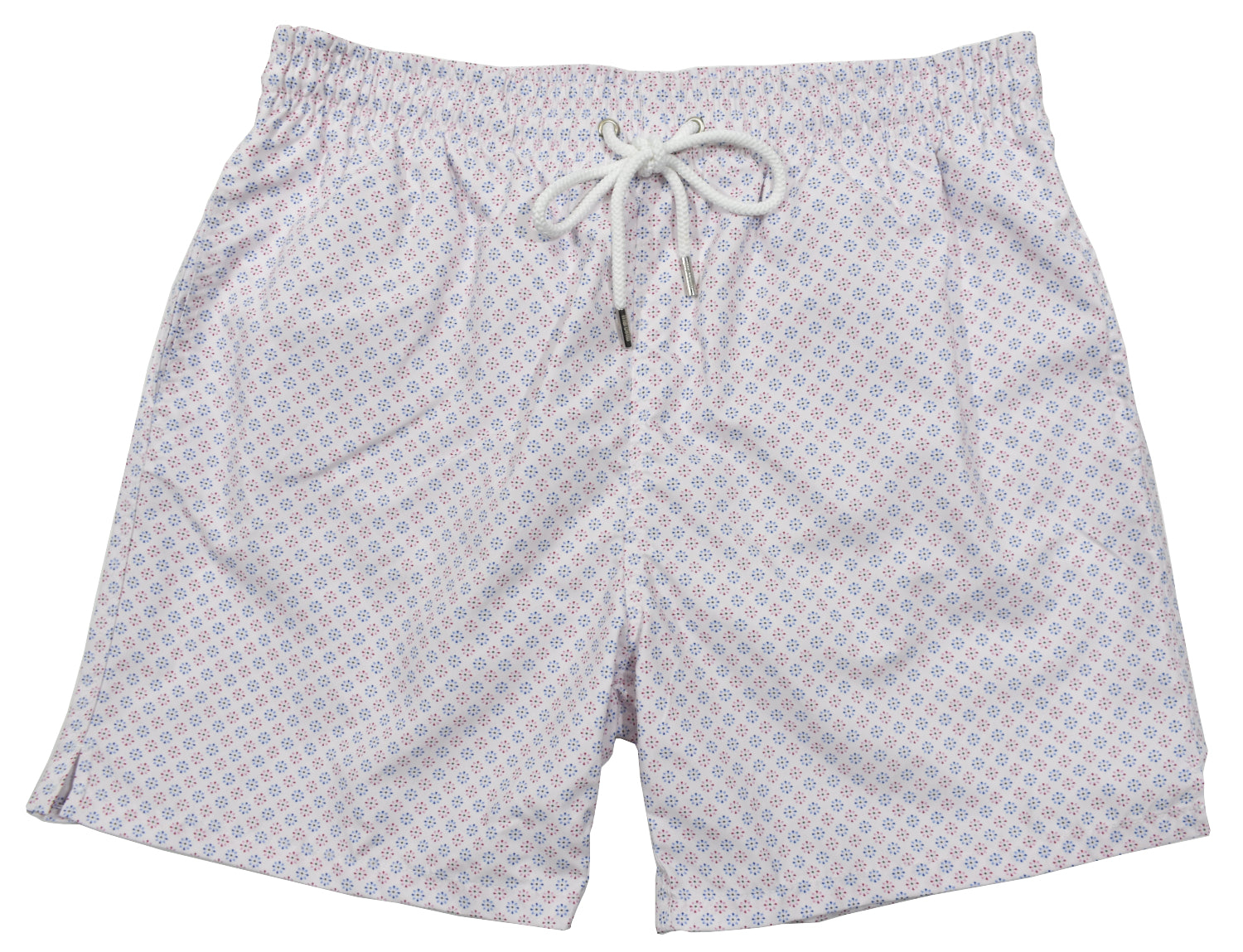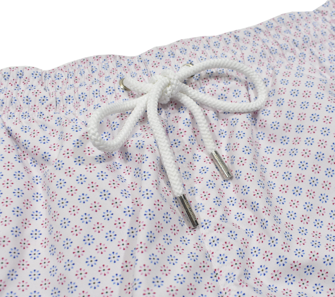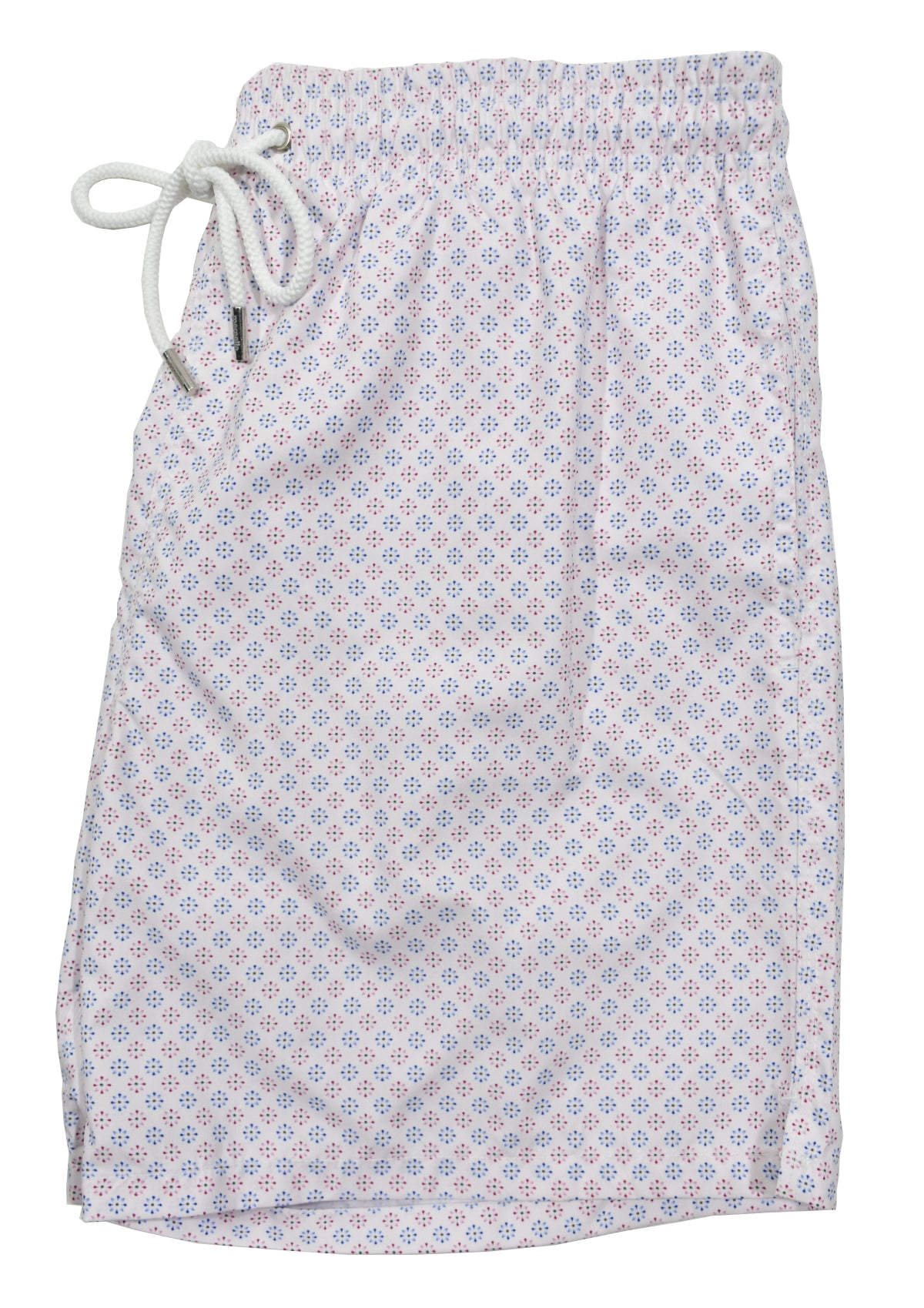 Soft quick dry fabric with a classic mesh lining. Front drawstrings with metal Marcello engraved ends. Front draw string grommets to allow tying outside or inside. Back center seam upper grommets to release air. Back pocket with button hole to release water. Delivered in a solid navy travel bag, with Marcello stamped in white, red draw strings and white stitching. Classic fit, 5.5" length.