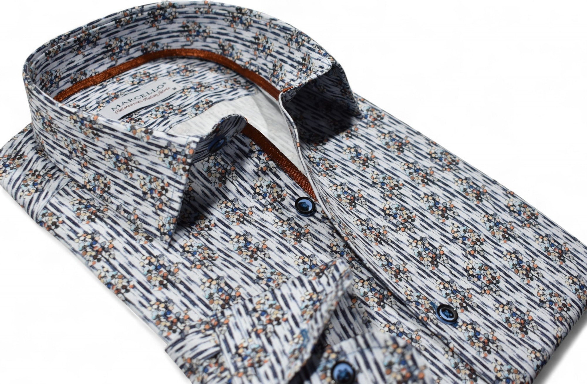 Marcello sport shirts feature a medium collar, neck band and edge placket taping. Trim fabrics and fashion prints add to the look. Premium cotton fabrics, custom hand selected buttons and coordinated stitch detailing. Classic shaped fit.