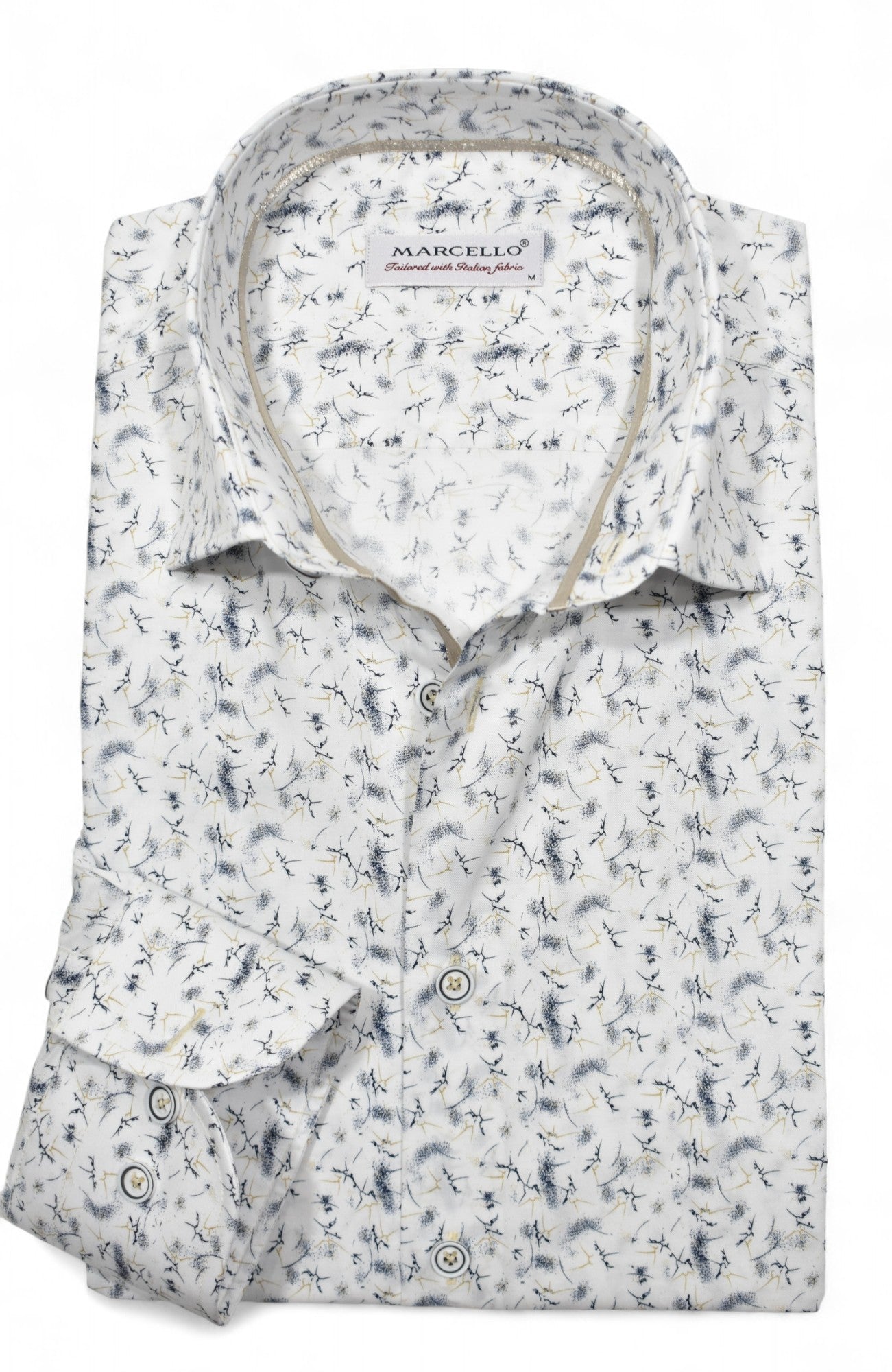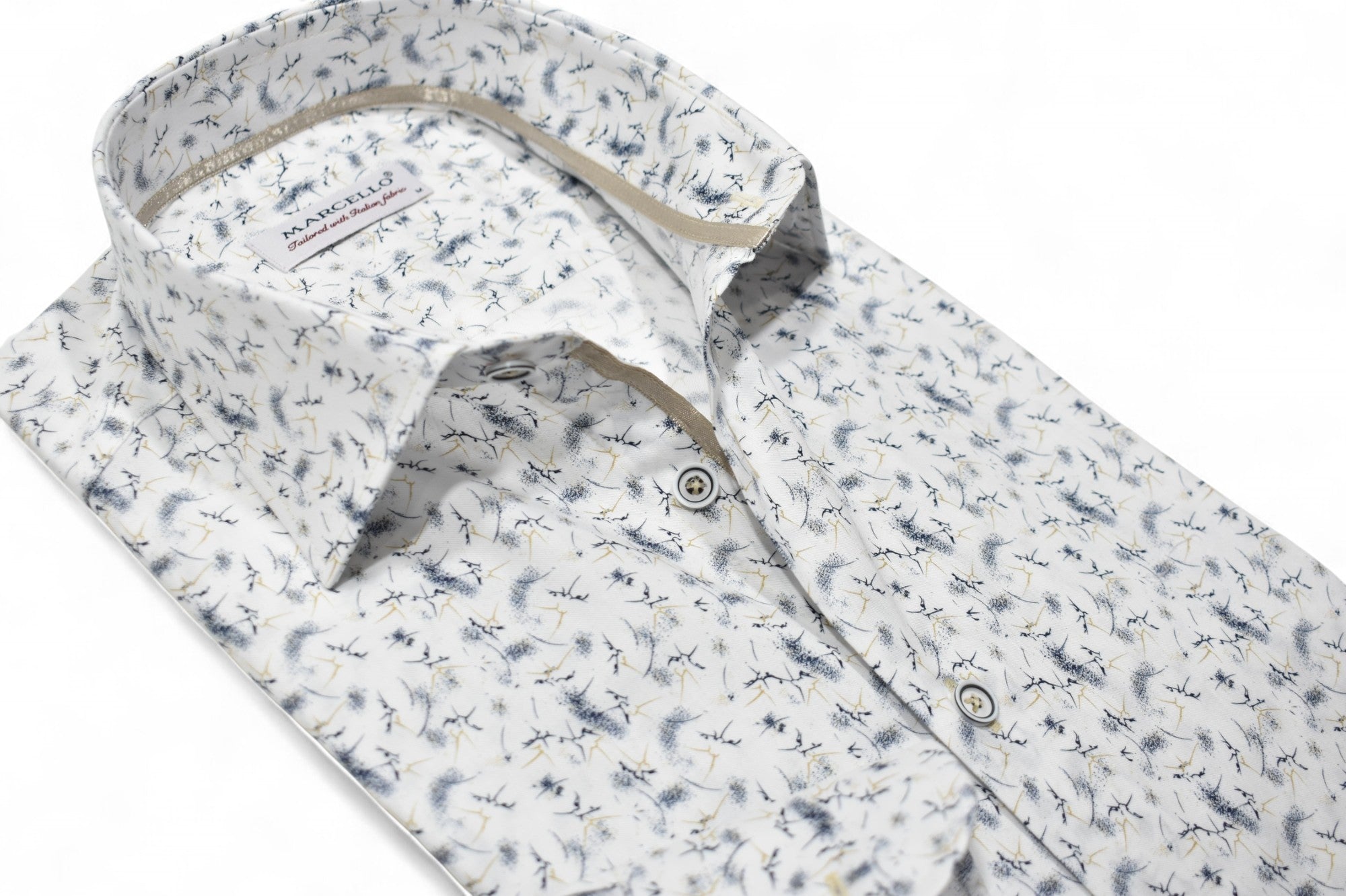 Marcello sport shirts feature a medium collar, neck band and edge placket taping. Trim fabrics and fashion prints add to the look. Premium cotton fabrics, custom hand selected buttons and coordinated stitch detailing. Classic shaped fit.