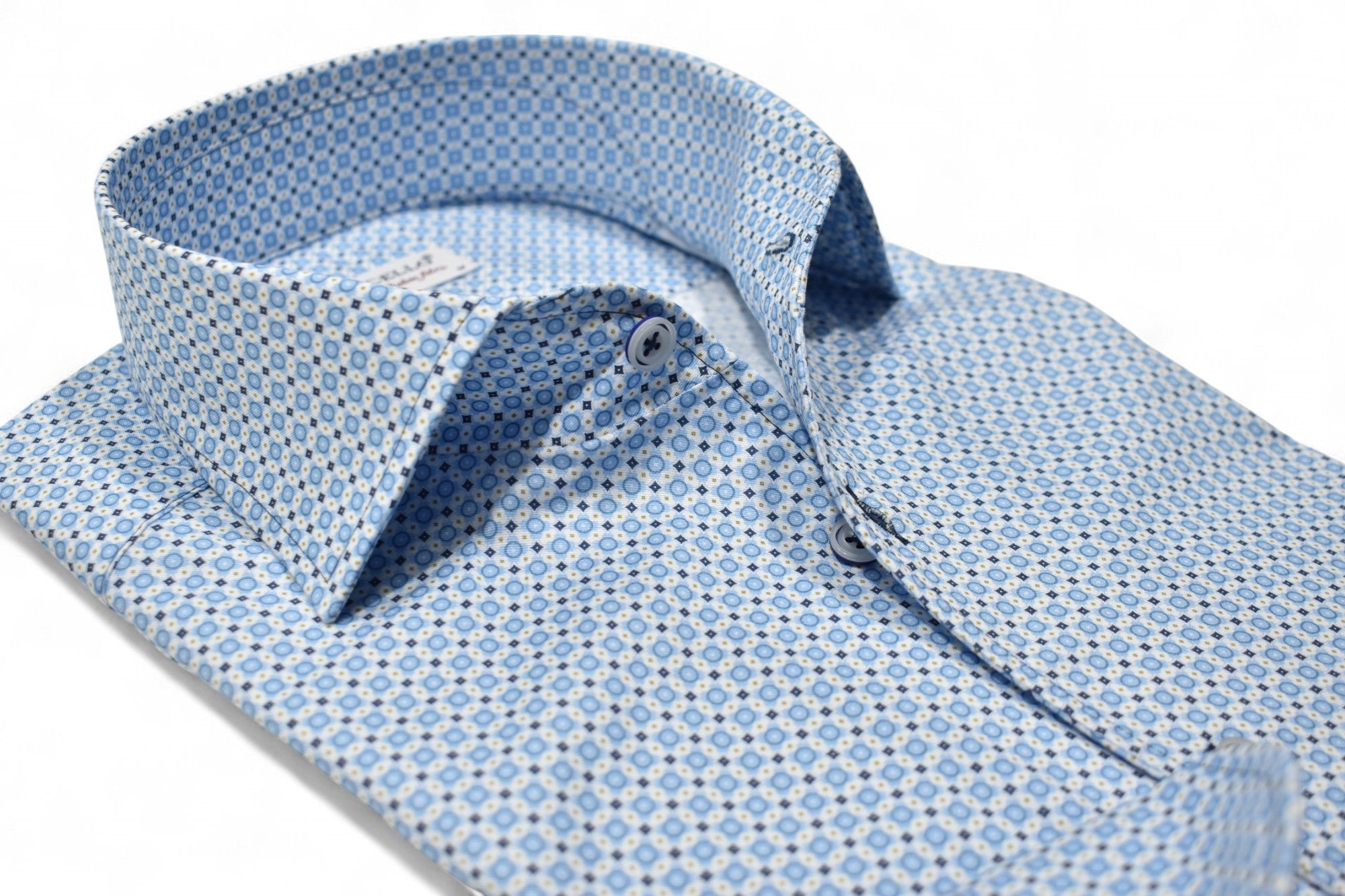 The classic and clean allover medallion pattern works well for dress or fashion events and creates an unmistakable style. Featuring the Marcello one piece collar that stands perfectly and makes this type of shirt an outstanding selection to wear under a sport coat. Match buttons and stitch detailing, and a classic shaped fit.