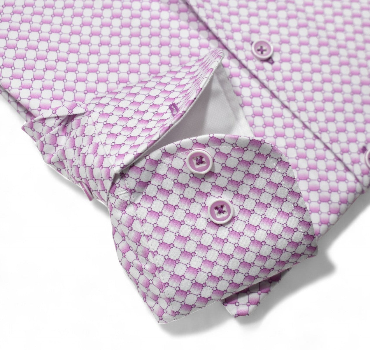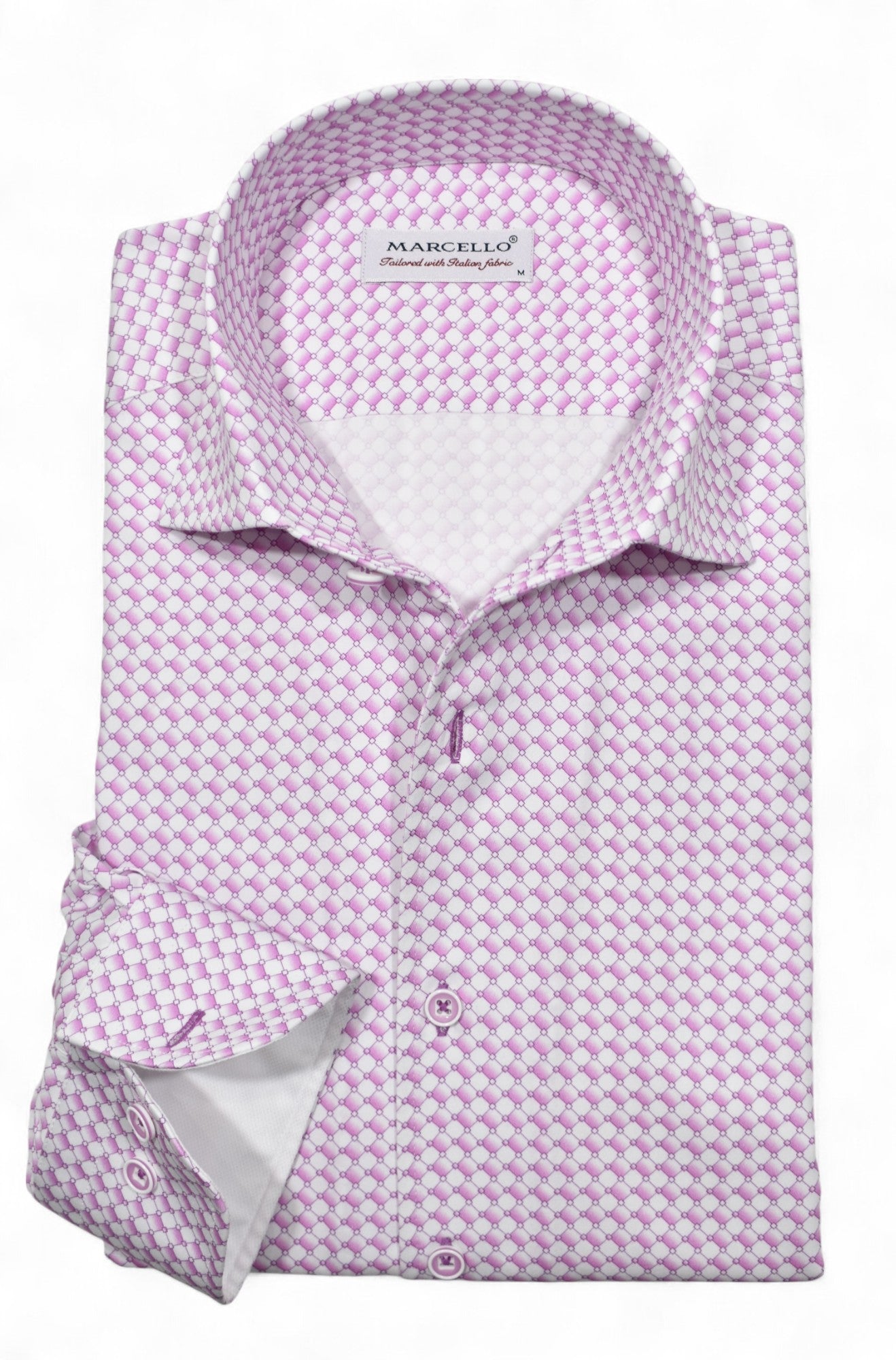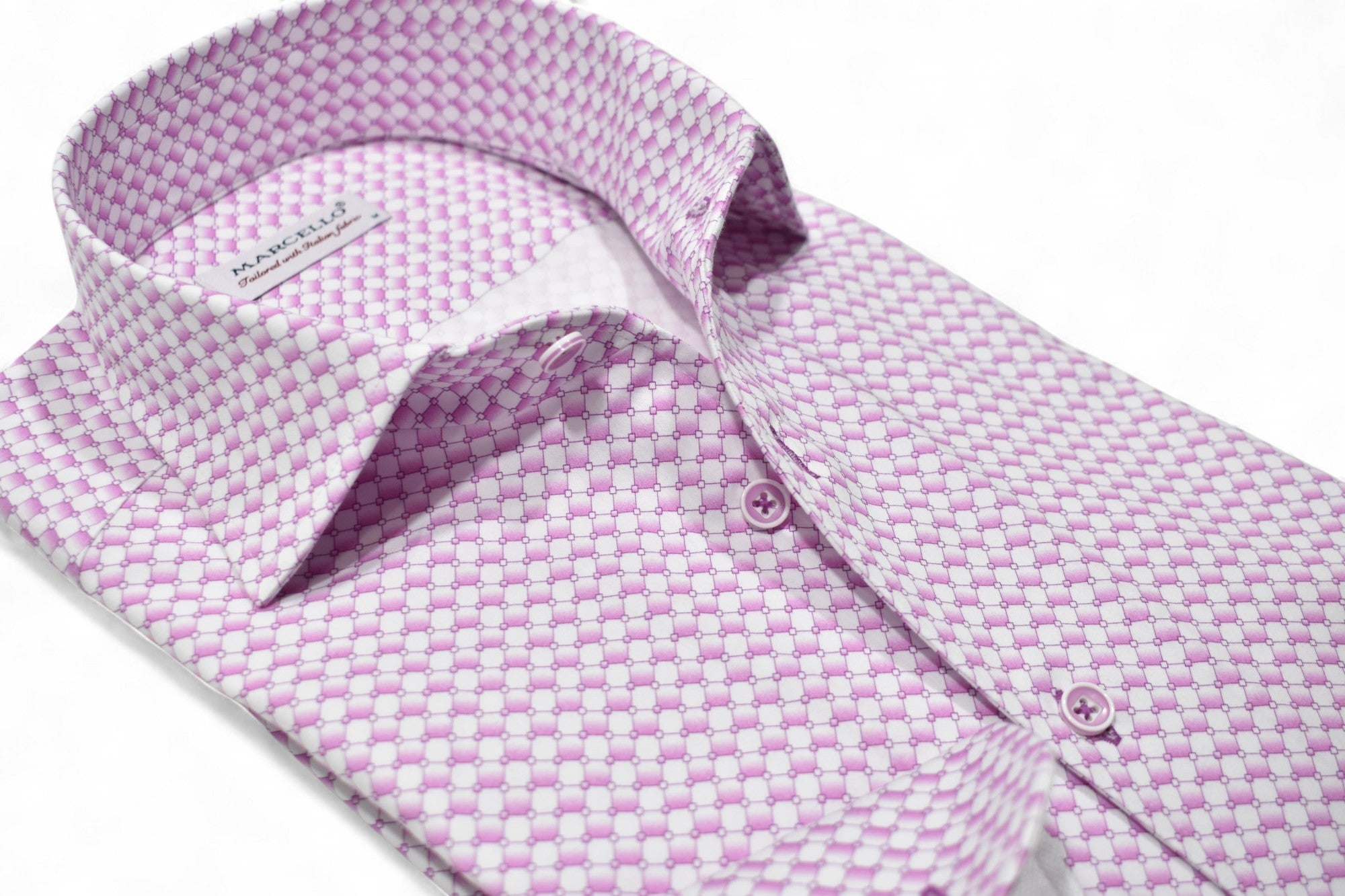 Shades of a pink geometric pattern on a soft touch cotton fabric and perfectly matched buttons make this shirt unique. With the perfected Marcello one piece collar, this shirt is an excellent choice worn alone or fantastic under a sportcoat. The image is nothing short of rich style. Classic shaped fit.