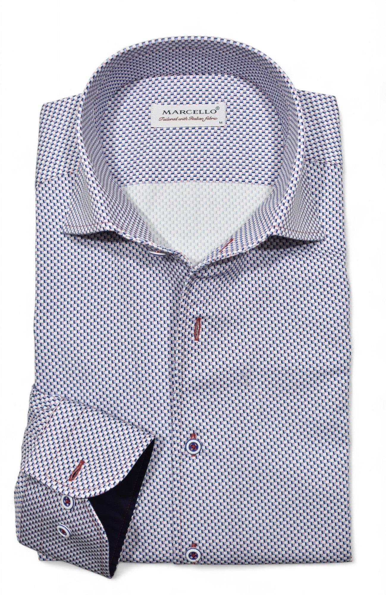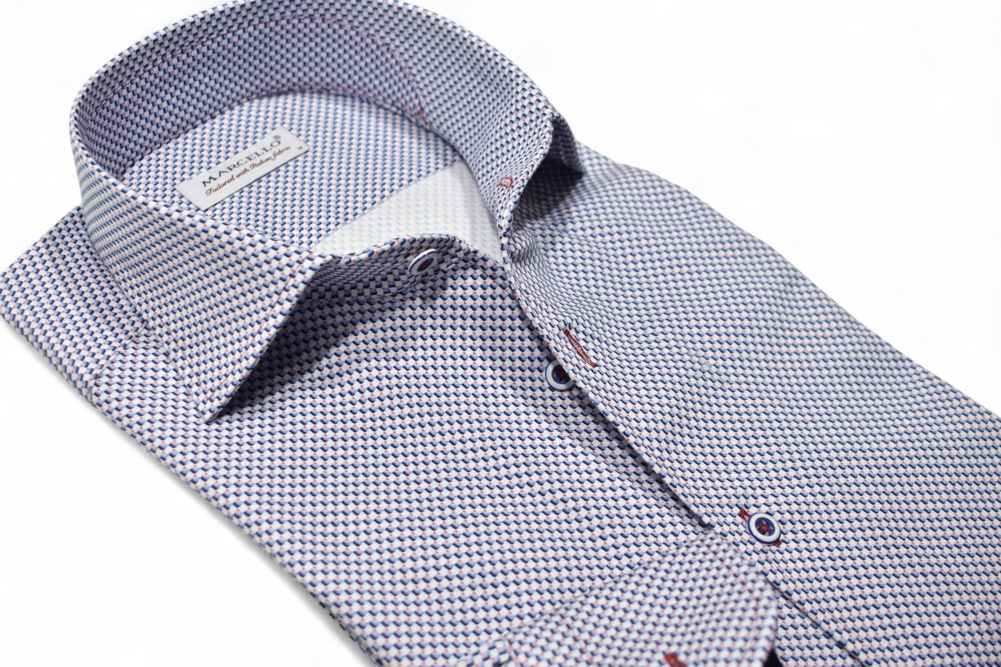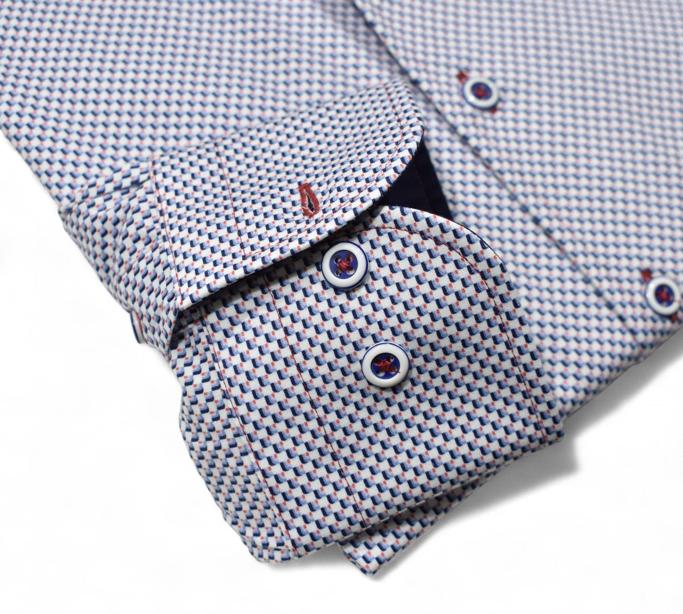 A salute to the American color palette, this fine box geometric pattern in our must have one piece collar model is a great look with any shades of denim or pants. The perfectly matched buttons and contrast red stitching complete the look. Soft touch cotton sateen fabric and a classic shaped fit.