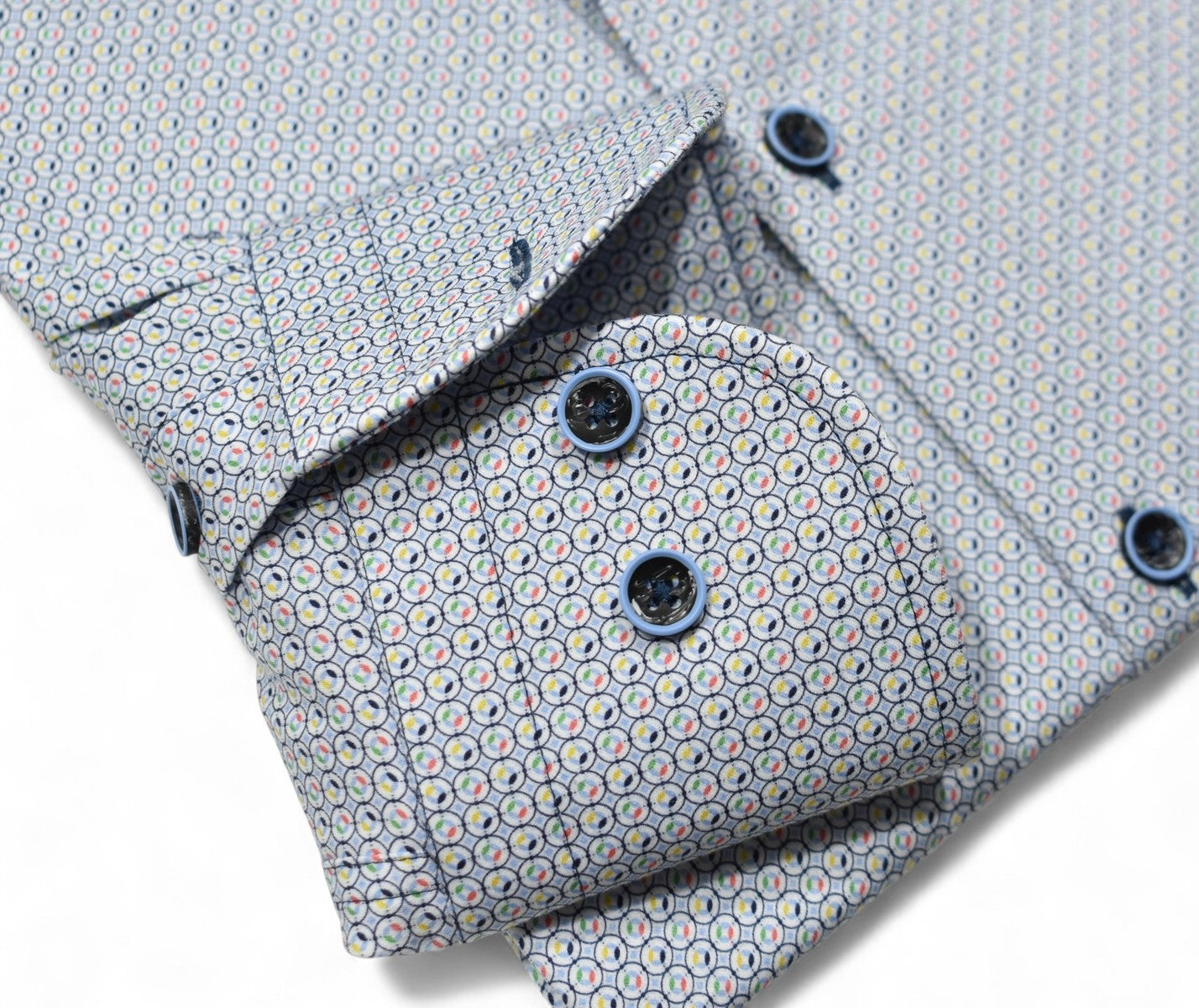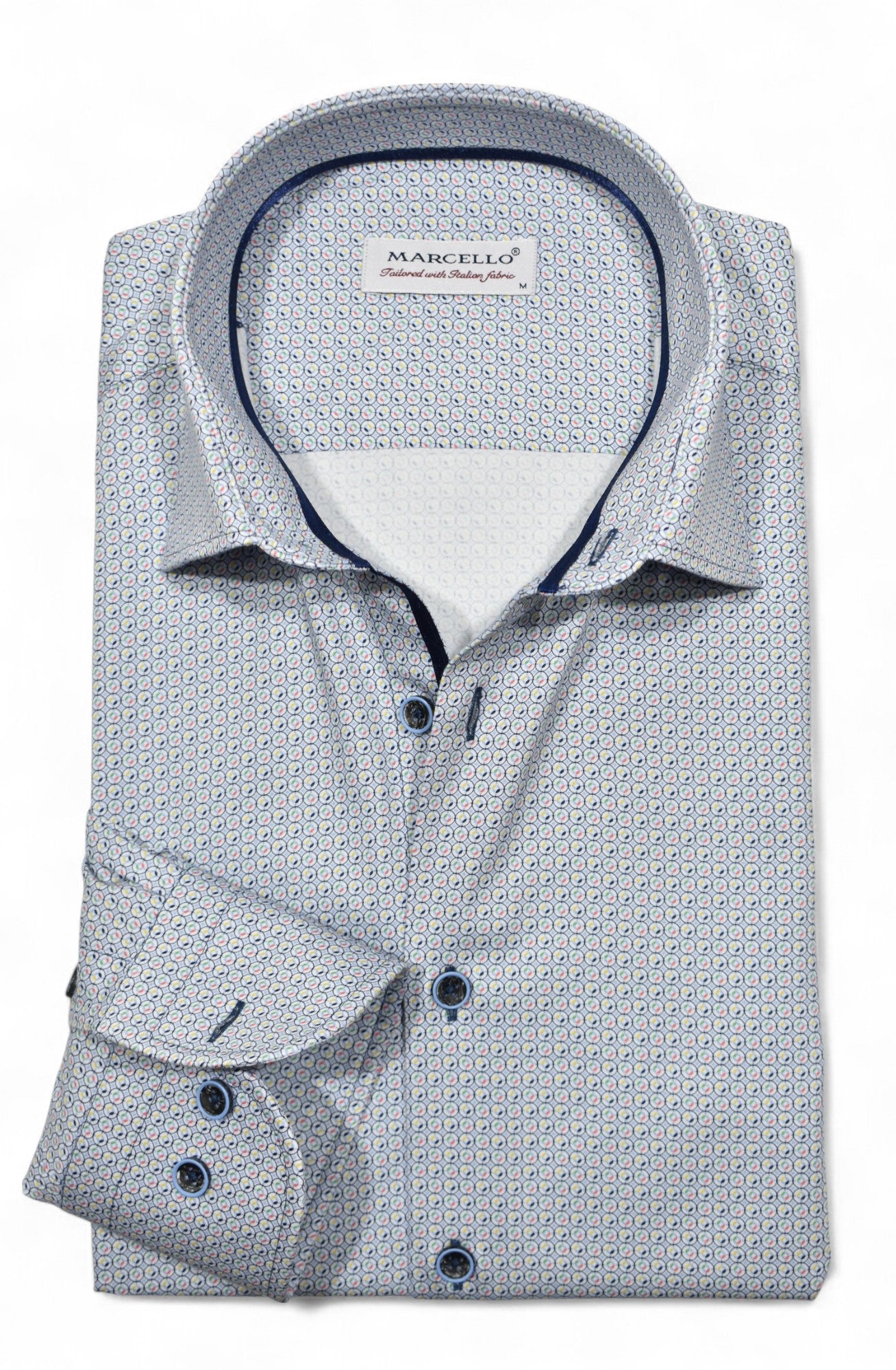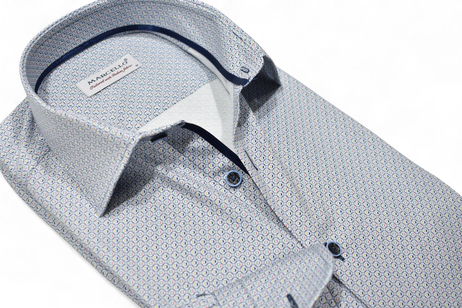 Marcello sport shirts feature a medium collar, neck band and edge placket taping. Trim fabrics and fashion prints add to the look. Premium cotton fabrics, custom hand selected buttons and coordinated stitch detailing. Classic shaped fit.