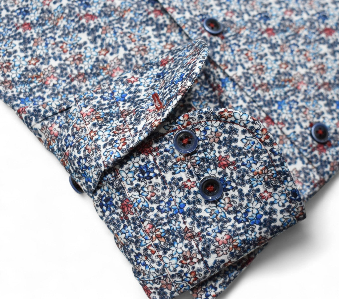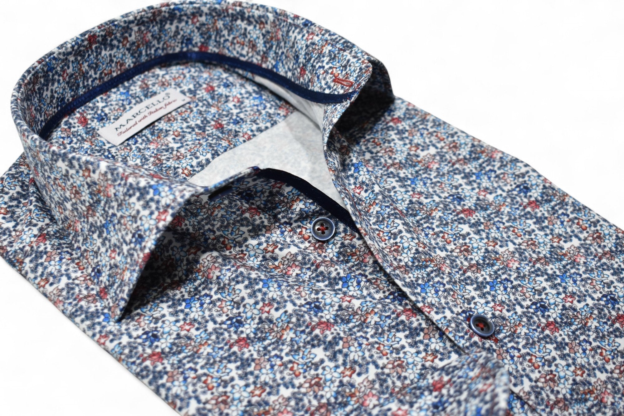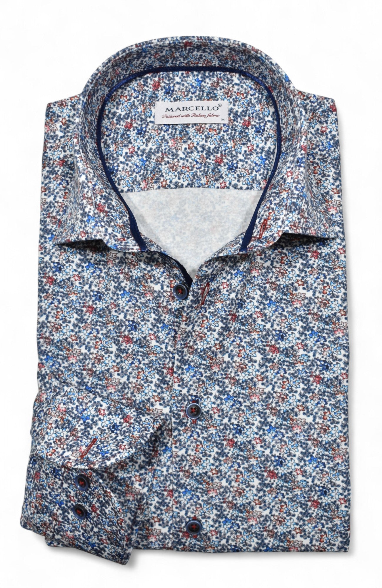 Marcello sport shirts feature a medium collar, neck band and edge placket taping. Trim fabrics and fashion prints add to the look. Premium cotton fabrics, custom hand selected buttons and coordinated stitch detailing. Classic shaped fit.