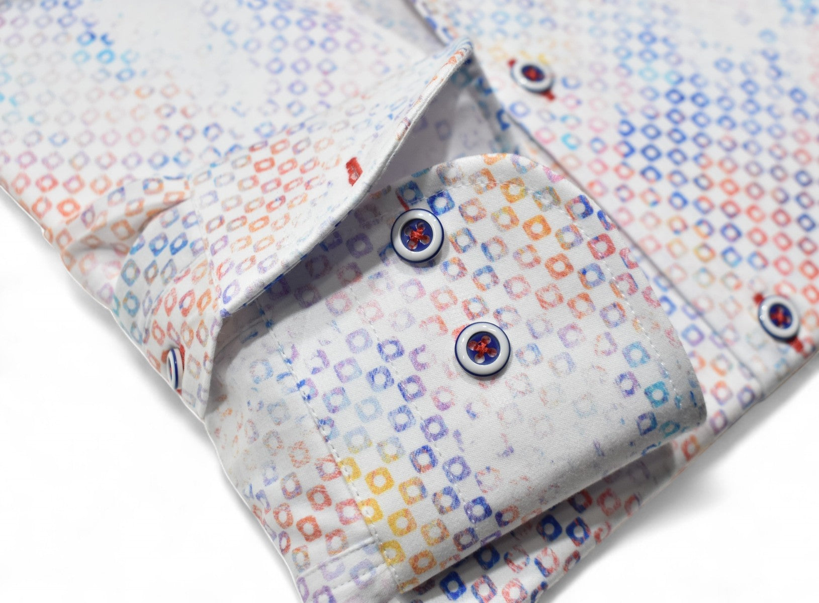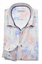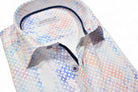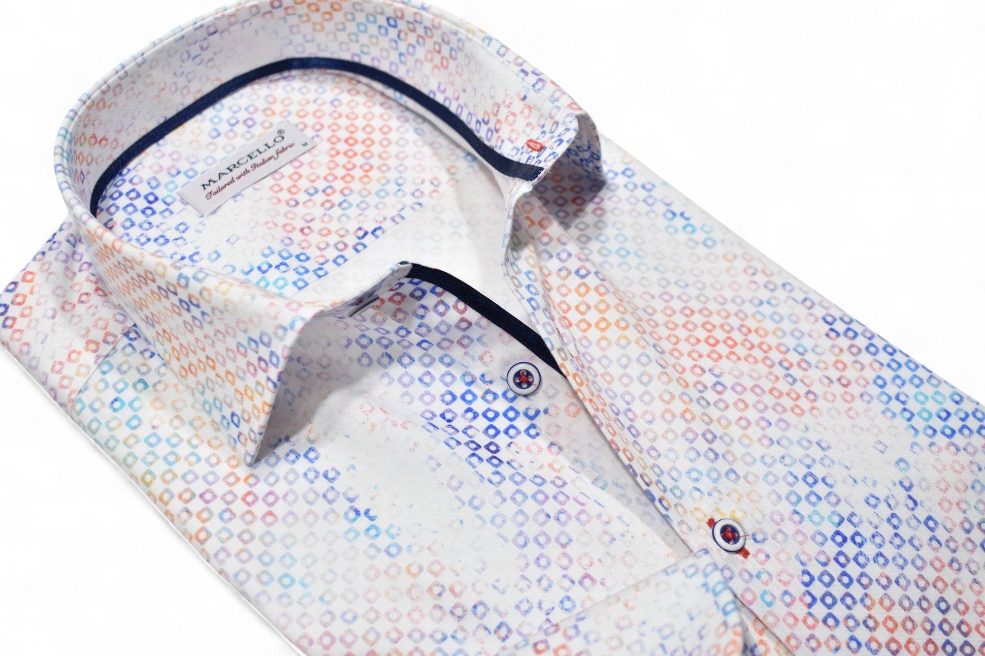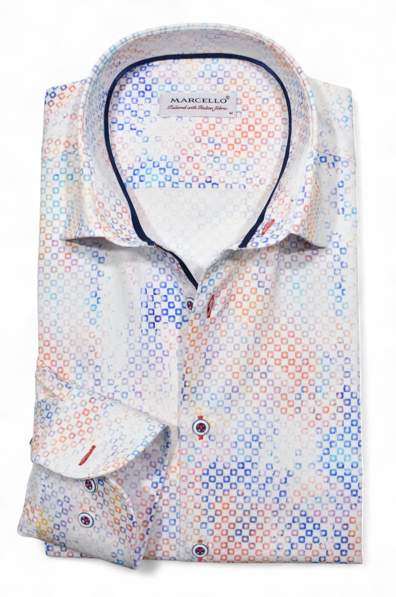 Marcello sport shirts feature a medium collar, neck band and edge placket taping. Trim fabrics and fashion prints add to the look. Premium cotton fabrics, custom hand selected buttons and coordinated stitch detailing. Classic shaped fit.