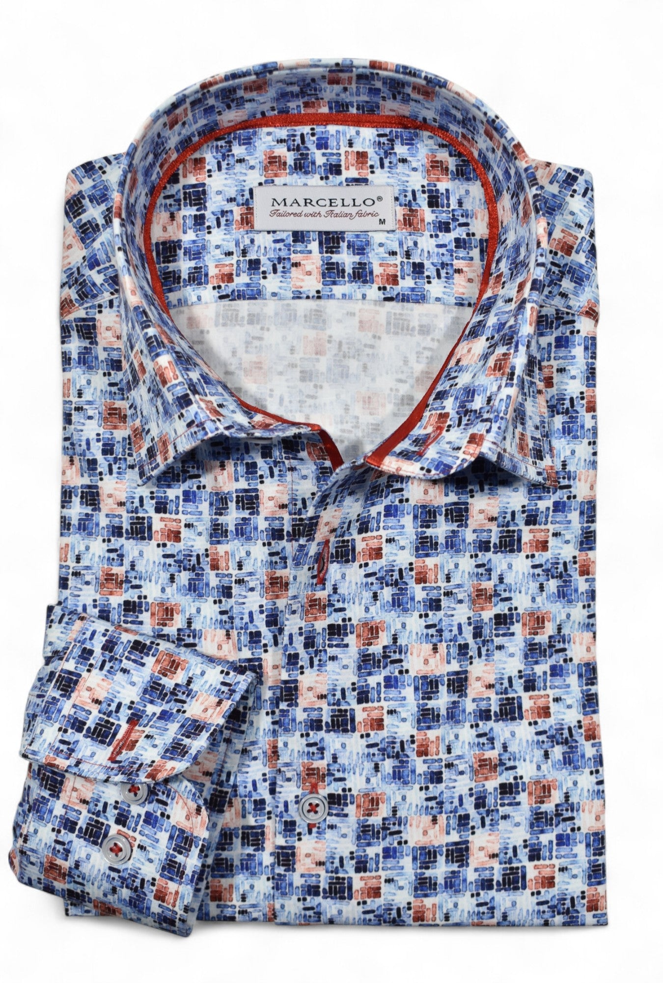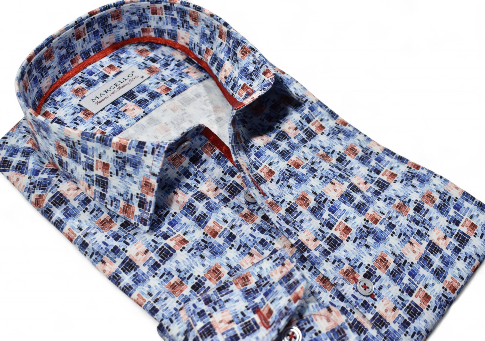 Marcello sport shirts feature a medium collar, neck band and edge placket taping. Trim fabrics and fashion prints add to the look. Premium cotton fabrics, custom hand selected buttons and coordinated stitch detailing. Classic shaped fit.