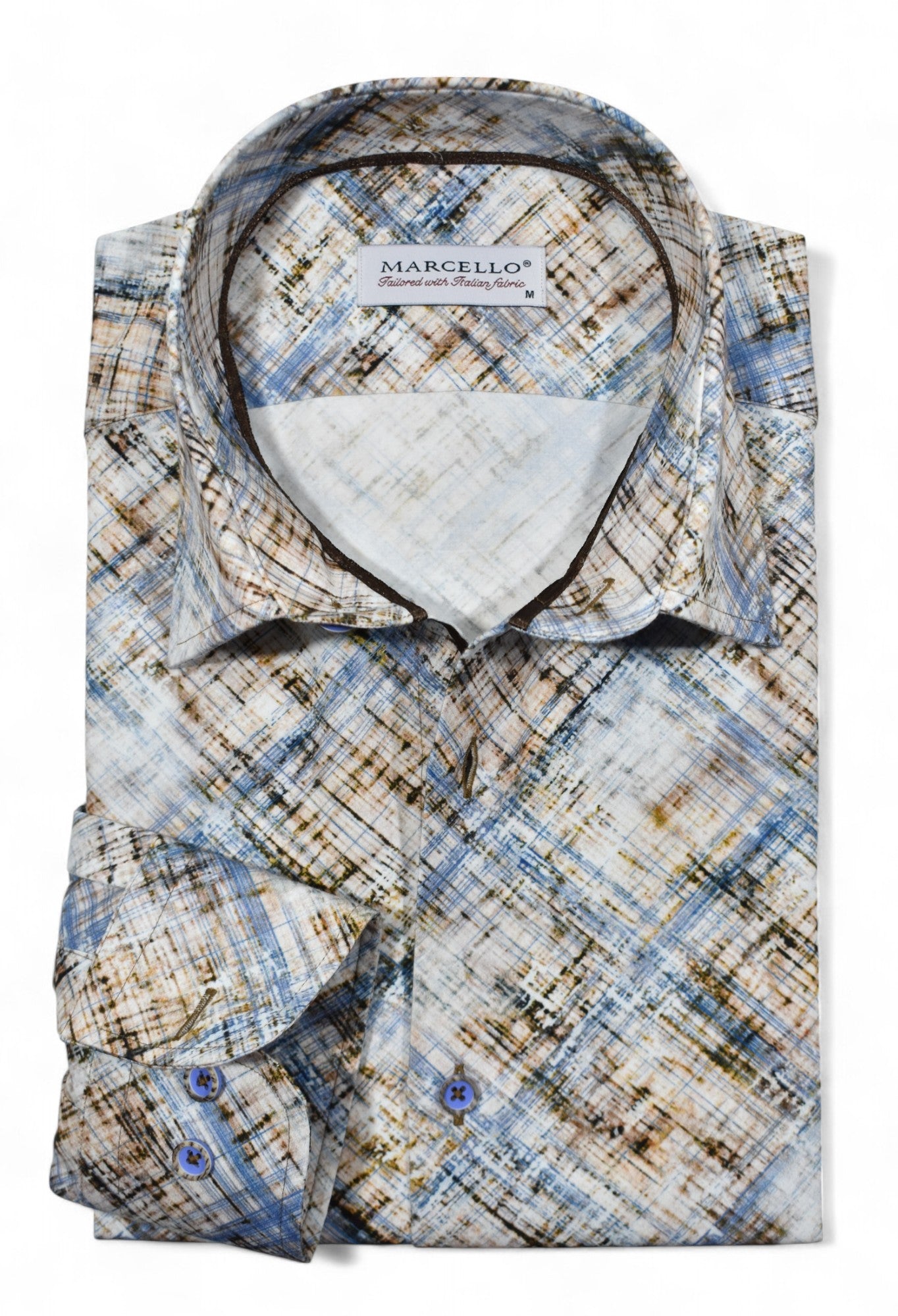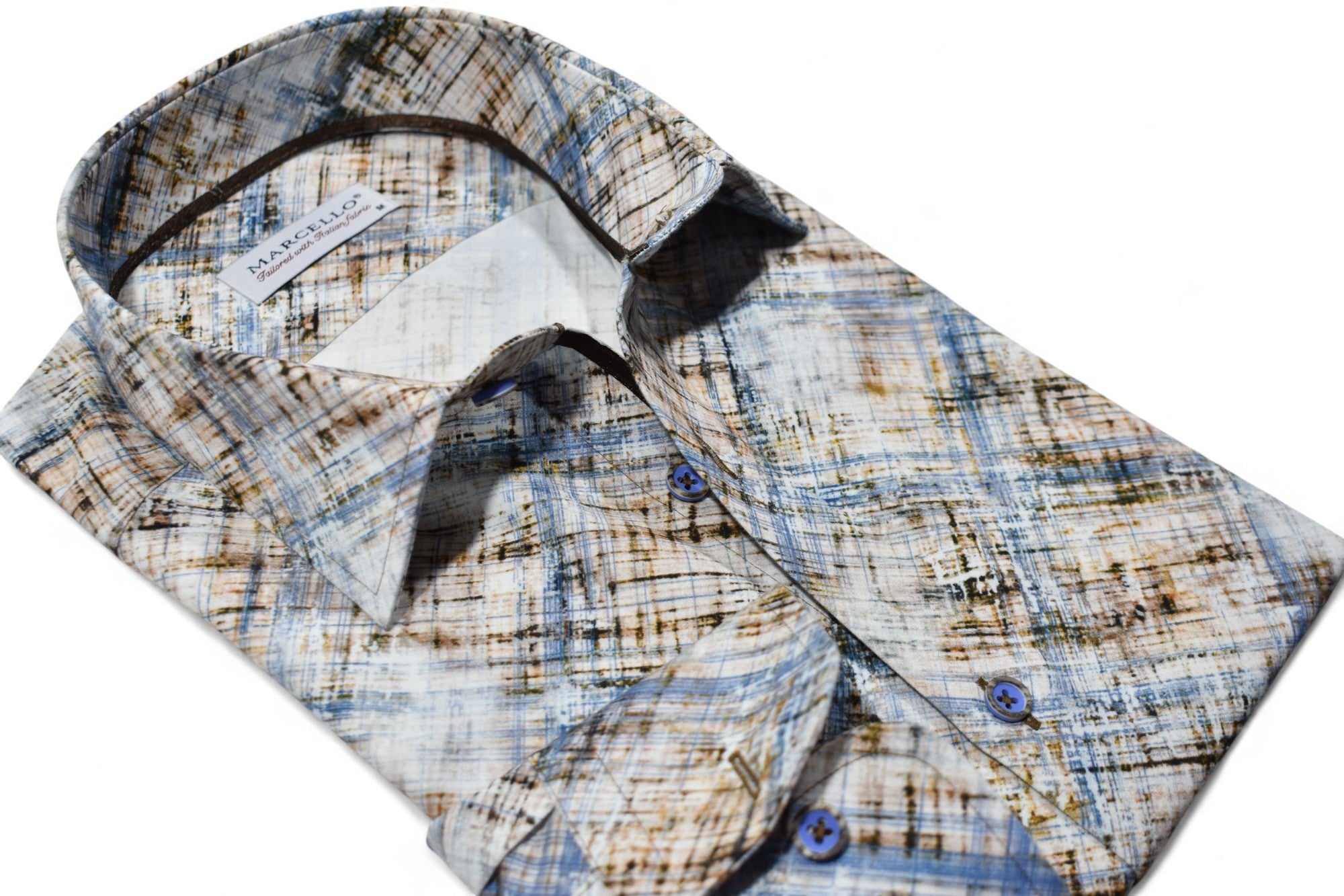 Marcello sport shirts feature a medium collar, neck band and edge placket taping. Trim fabrics and fashion prints add to the look. Premium cotton fabrics, custom hand selected buttons and coordinated stitch detailing. Classic shaped fit.