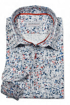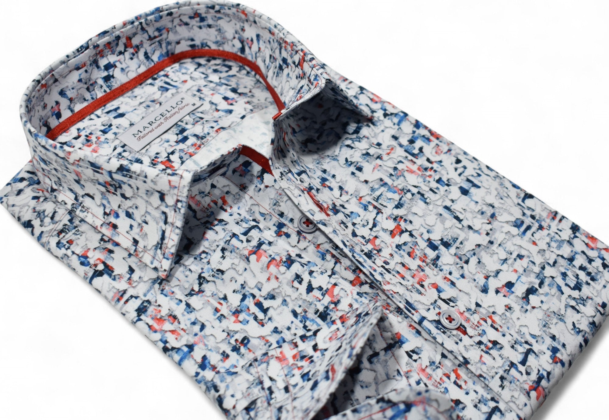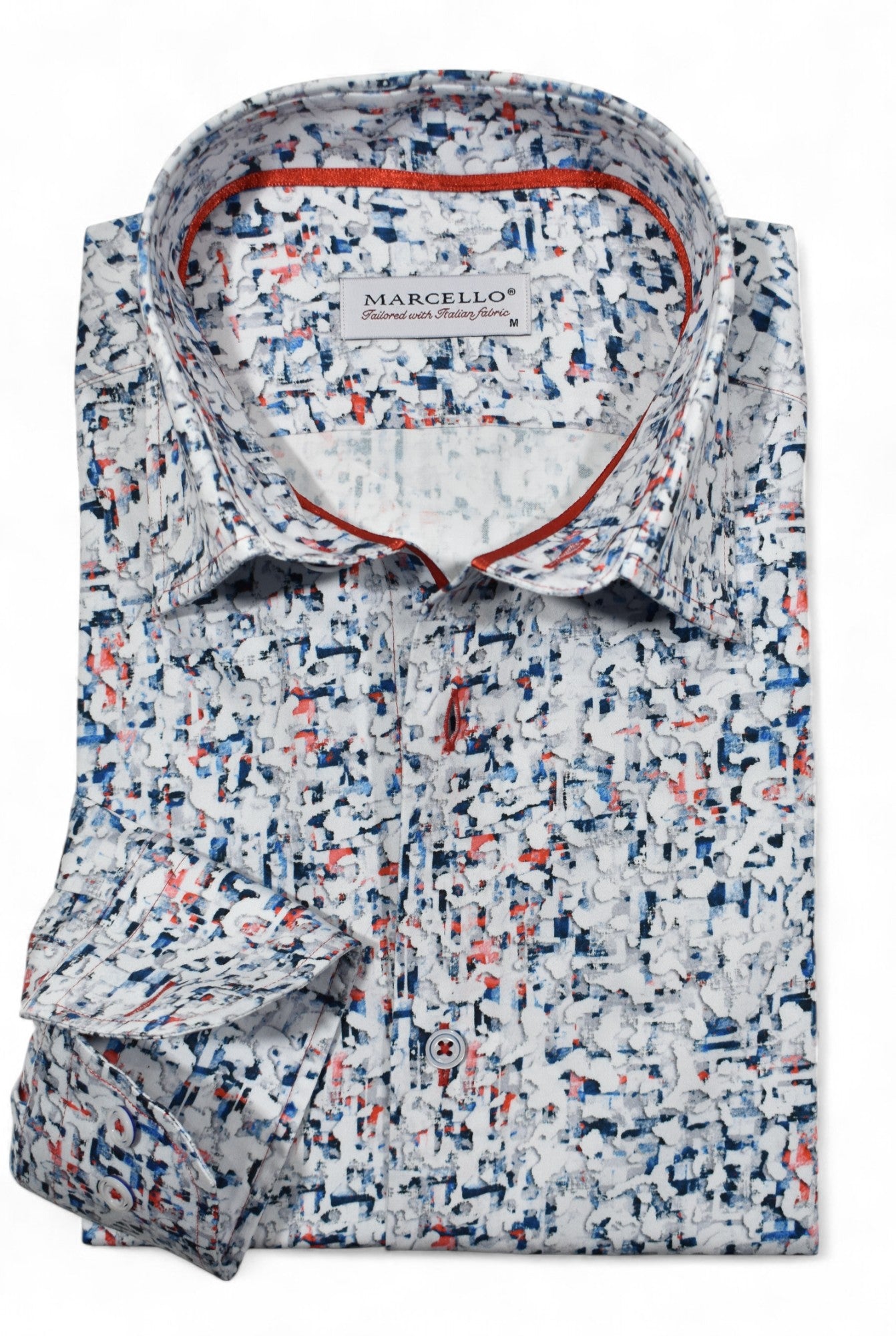 Marcello sport shirts feature a medium collar, neck band and edge placket taping. Trim fabrics and fashion prints add to the look. Premium cotton fabrics, custom hand selected buttons and coordinated stitch detailing. Classic shaped fit.