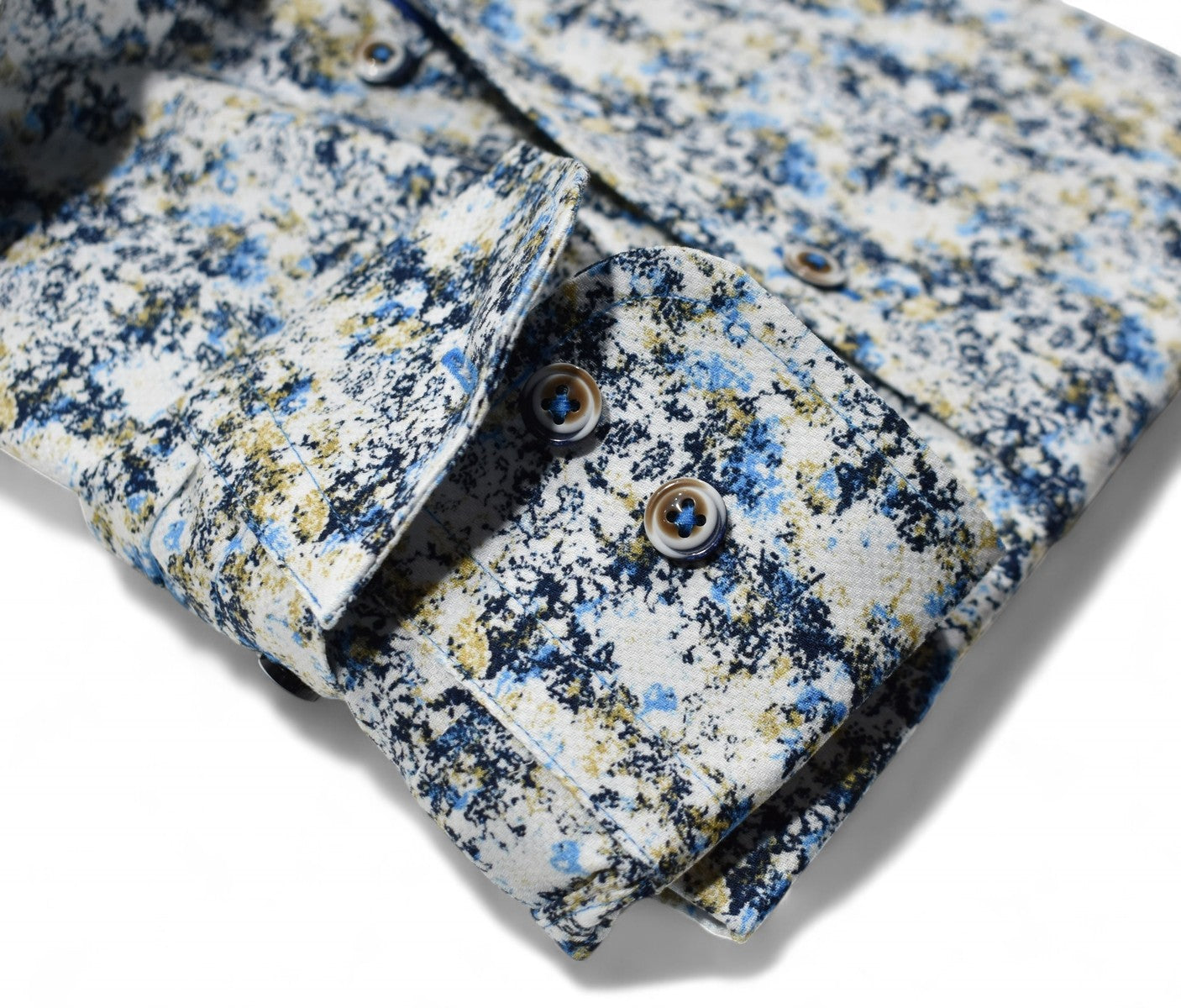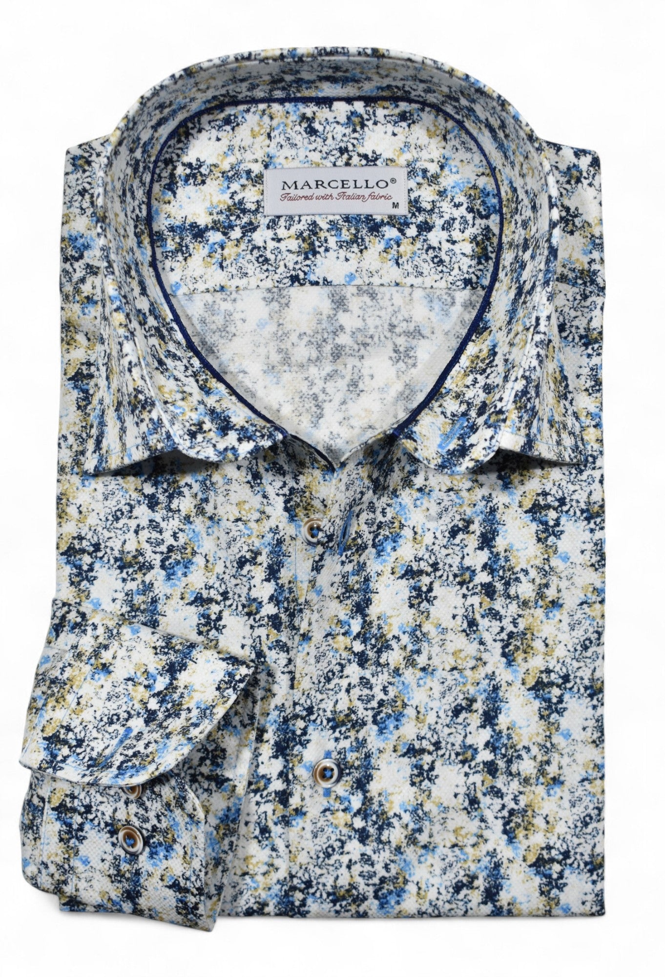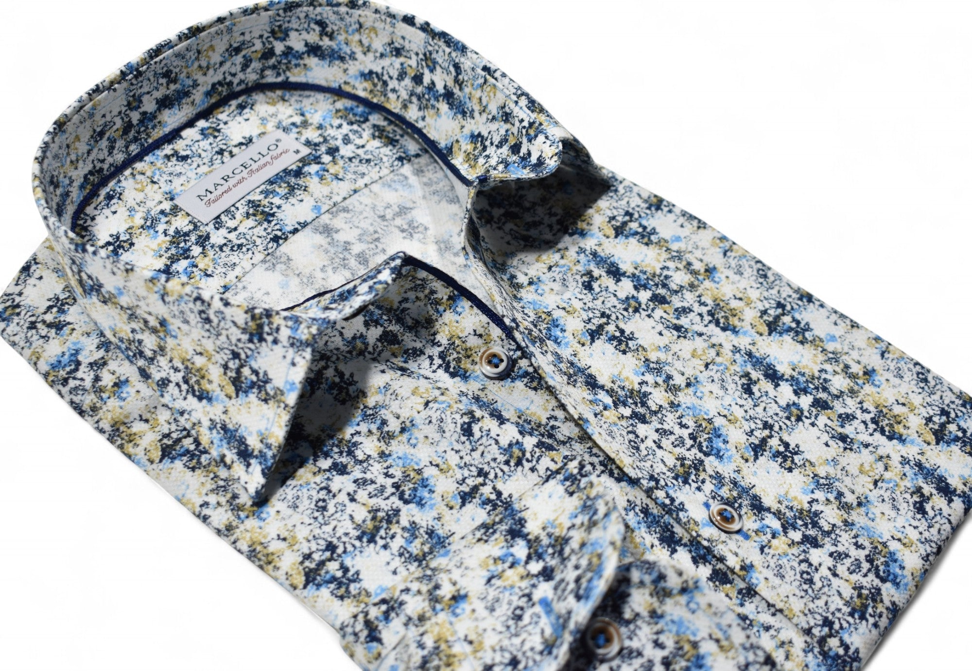 Marcello sport shirts feature a medium collar, neck band and edge placket taping. Trim fabrics and fashion prints add to the look. Premium cotton fabrics, custom hand selected buttons and coordinated stitch detailing. Classic shaped fit.
